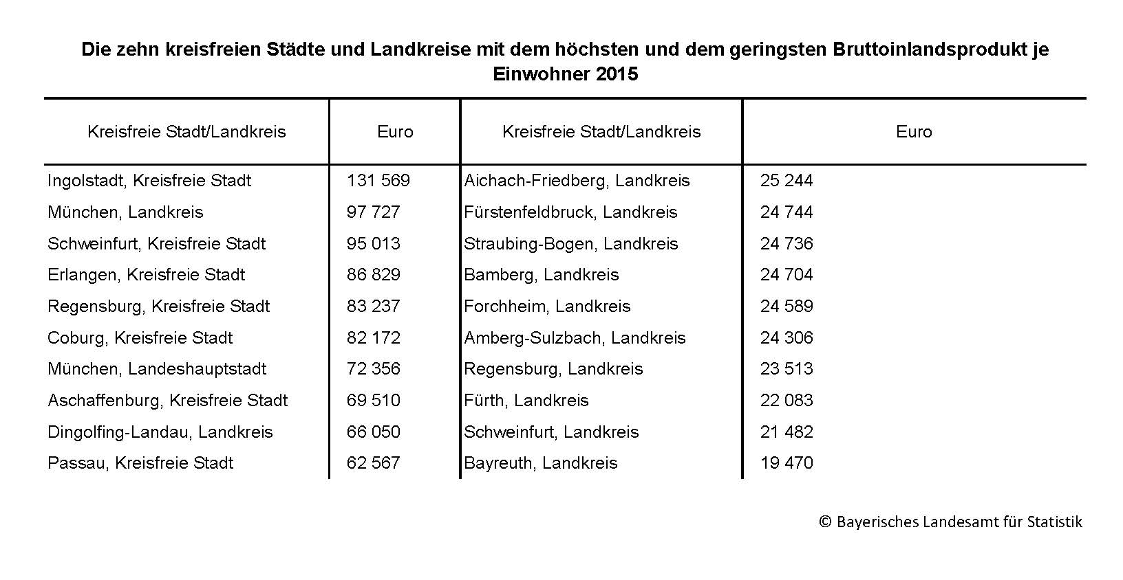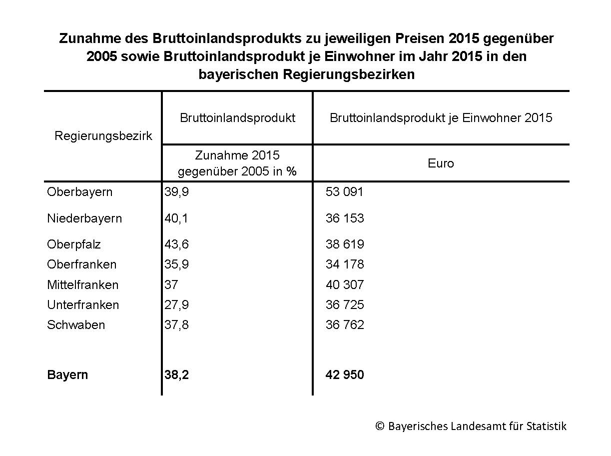 Das Bruttoinlandsprodukt je Einwohner, das als Maßstab der Wirtschaftskraft eines Landes oder einer Region gilt, war 2015 in Oberbayern mit 53 091 Euro und Mittelfranken mit 40 307 Euro am höchsten. Am niedrigsten war es in Oberfranken mit 34 178 Euro.