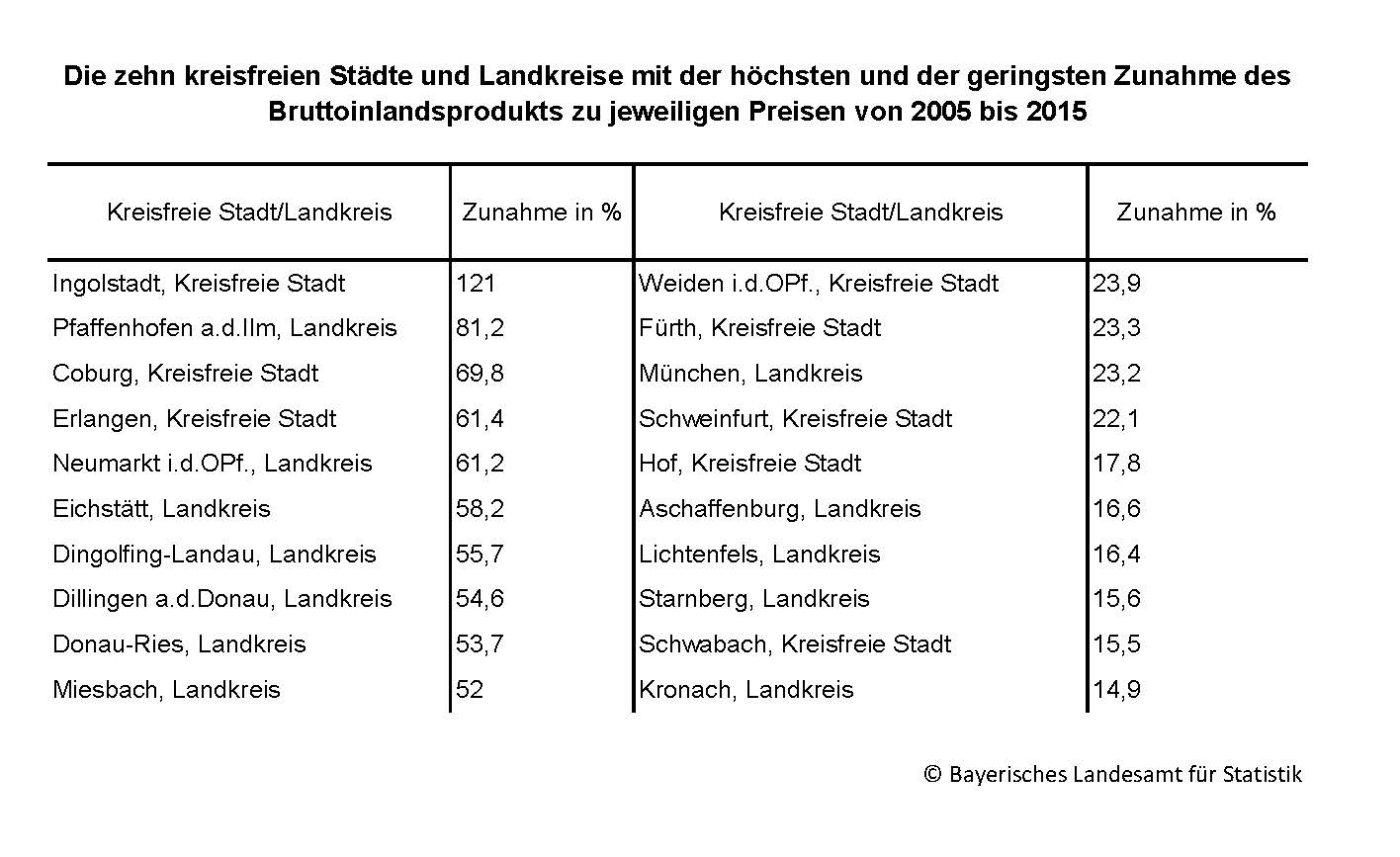 Auf der Ebene der kreisfreien Städte und Landkreise ragt Ingolstadt mit einer Zunahme des BIP von 121,0 Prozent heraus. Mit einer Zunahme von 81,2 Prozent folgt der Landkreis Pfaffenhofen a. d. Ilm mit deutlichem Abstand. In weiteren drei Kreisen lag das Wirtschaftswachstum von 2005 bis 2015 über 60 Prozent. Schlusslicht war der Landkreis Kronach (+14,9 Prozent).