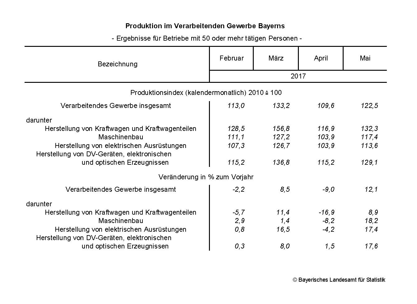 Nach Angaben des Bayerischen Landesamts für Statistik konnte die Produktion des Verarbeitenden Gewerbes im Mai 2017 um 12,1 Prozent gegenüber dem Vorjahresergebnis gesteigert werden. Die ersten fünf Monate des Jahres erbrachten ein Plus von 3,3 Prozent.