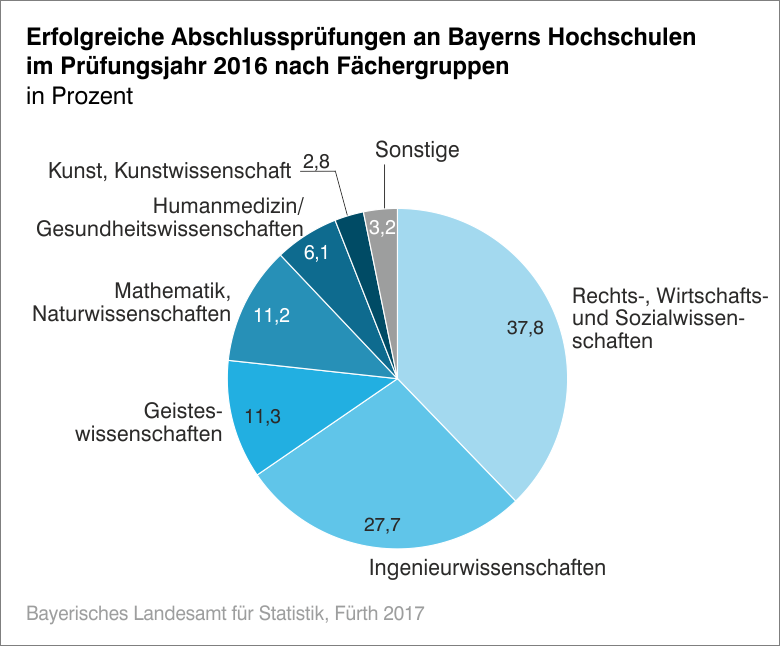 Wie das Bayerische Landesamt für Statistik mitteilt, wurden im Prüfungsjahr 2016 an Bayerns Hochschulen insgesamt 78 707 Abschlussprüfungen erfolgreich abgelegt. Damit meldeten die Prüfungskanzleien 1,6 Prozent mehr bestandene Prüfungen als in der Vorperiode. Mit dem erfolgreichen Abschluss der Promotion erwarben 2 053 Akademikerinnen und 2 650 Akademiker einen Doktortitel.