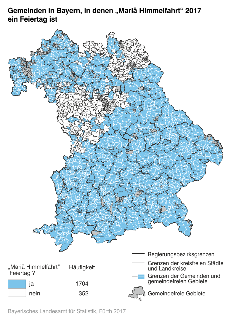 Gemäß Art. 1 Abs. 1 Nummer 2 des Gesetzes über den Schutz der Sonn- und Feiertage (Feiertagsgesetz) ist in Bayern der 15. August – „Mariä Himmelfahrt“ – in einer Gemeinde dann ein gesetzlicher Feiertag, wenn dort mehr katholische als evangelische Einwohner ihren Hauptwohnsitz hatten. Auf welche Kommunen dies zutrifft, stellt gemäß Art. 1 Abs. 3 Feiertagsgesetz das Bayerische Landesamt für Statistik auf Basis der letzten Volkszählung fest.