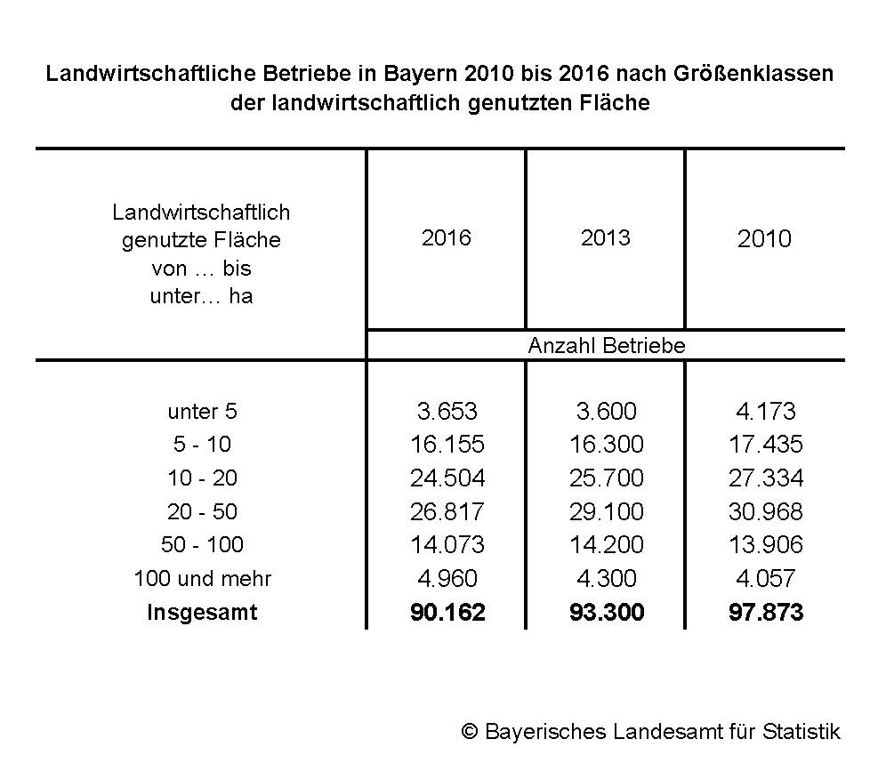 In der Agrarstrukturerhebung 2016 wurden in Bayern 90 162 landwirtschaftliche Betriebe ermittelt, die mindestens fünf Hektar landwirtschaftlich genutzte Fläche bewirtschaften oder bestimmte Mindestgrößen an Tierbeständen oder Spezialkulturen überschreiten.