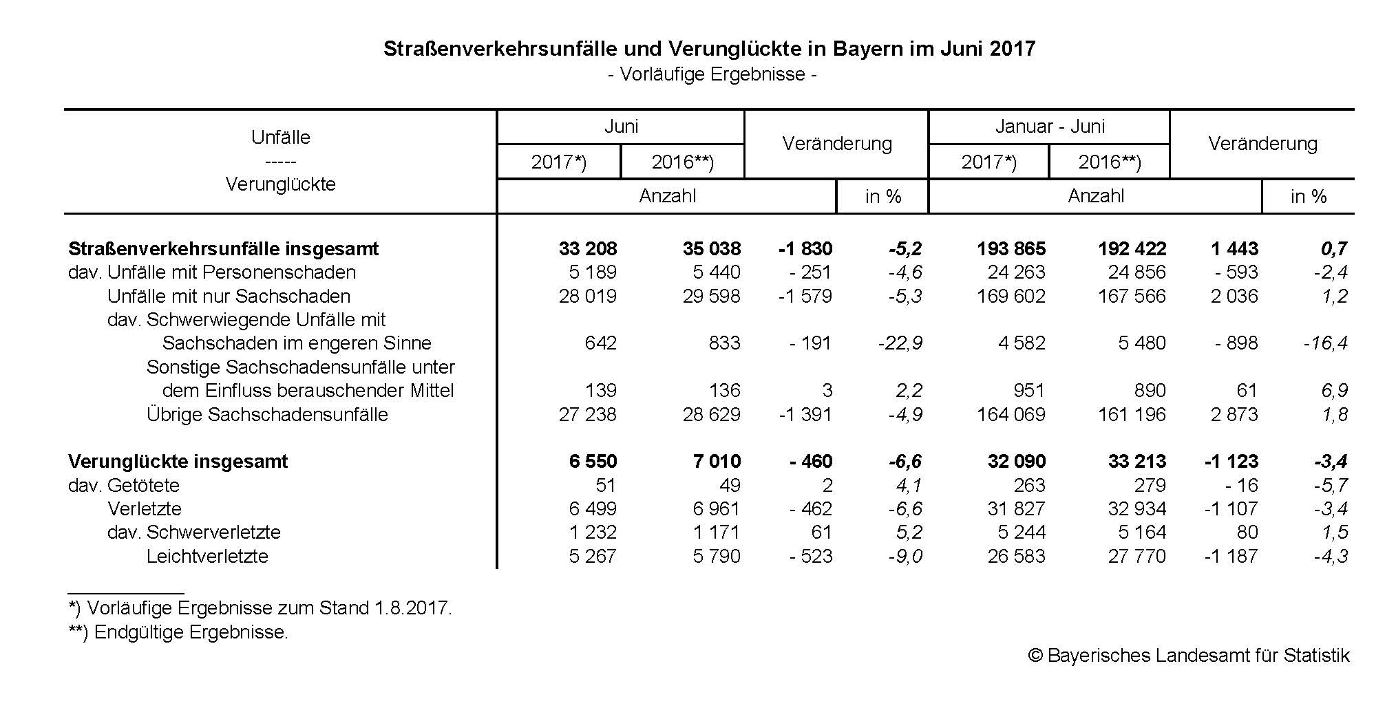 Nach den vorläufigen Meldungen der Polizei ereigneten sich im Juni 2017 auf Bayerns Straßen insgesamt 33 208 Unfälle. Das waren 5,2 Prozent weniger als im Vorjahresmonat. Nach Mitteilung des Bayerischen Landesamts für Statistik gingen Unfälle mit Personenschaden um 4,6 Prozent zurück, auch die Sachschadensunfälle sanken um 5,3 Prozent. Die Zahl der Verunglückten sank im Vergleich zum Juni 2016 um 6,6 Prozent.