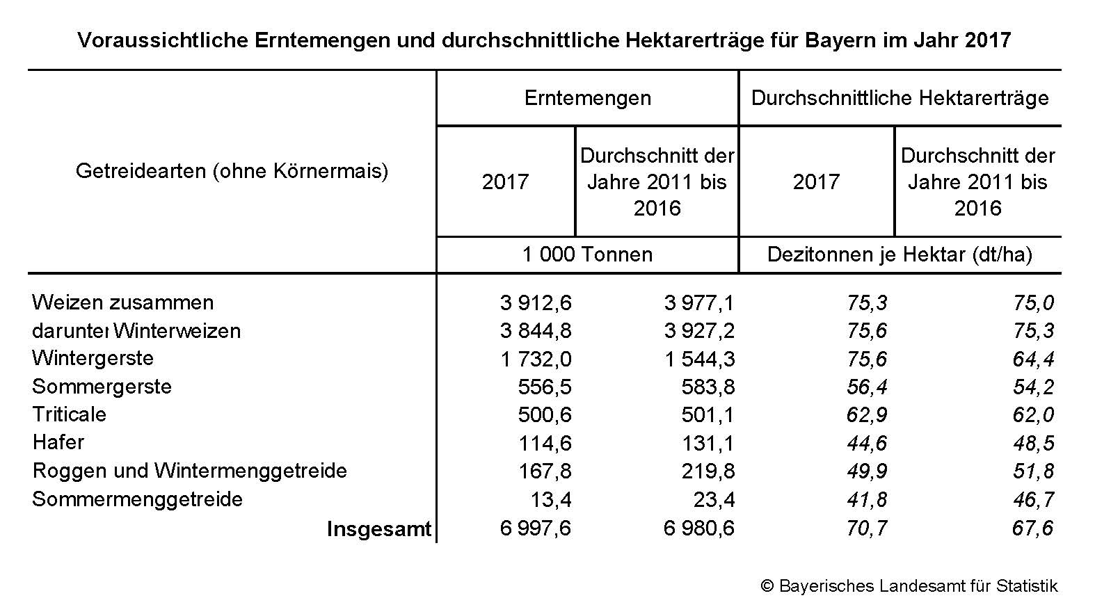 Nach Angaben des Bayerischen Landesamts für Statistik wird trotz der nicht immer guten Wetterbedingungen während der Pflanzenwachstums- und der Erntephase in Bayern in diesem Jahr eine im Vergleich zum sechsjährigen Mittel durchschnittliche Getreideernte (ohne Körnermais) von insgesamt rund 7,0 Millionen Tonnen erwartet. Der voraussichtliche Durchschnittsertrag liegt bei Winterweizen und Wintergerste jeweils bei 75,6 Dezitonnen je Hektar.