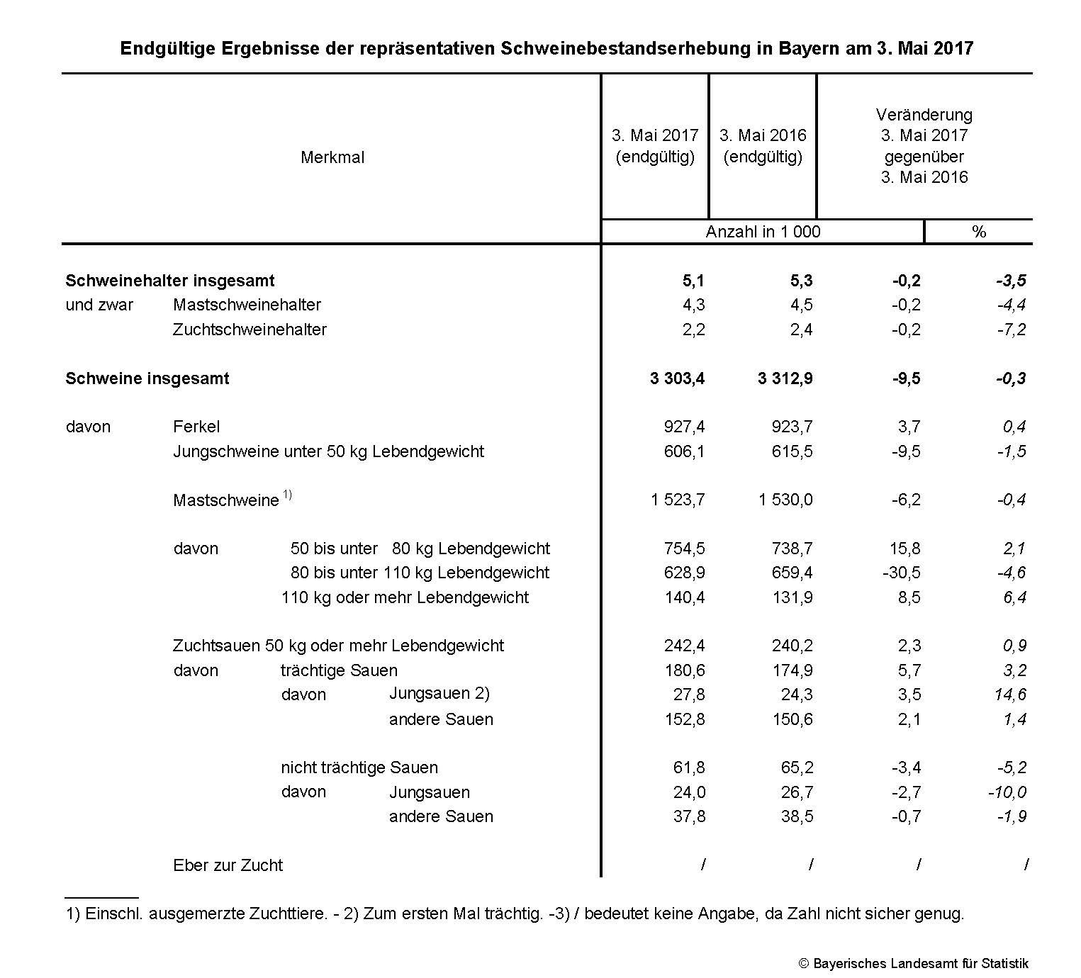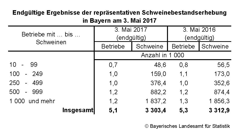Nach den endgültigen repräsentativen Ergebnissen der vom Landesamt für Statistik durchgeführten Erhebung über die Schweinebestände gab es in Bayern zum Stichtag 3. Mai 2017 rund 5 100 Schweine haltende Betriebe, die über mindestens 50 Schweine oder 10 Zuchtsauen verfügten. Insgesamt wurden in Bayern in diesen Betrieben 3 303 400 Schweine gehalten.