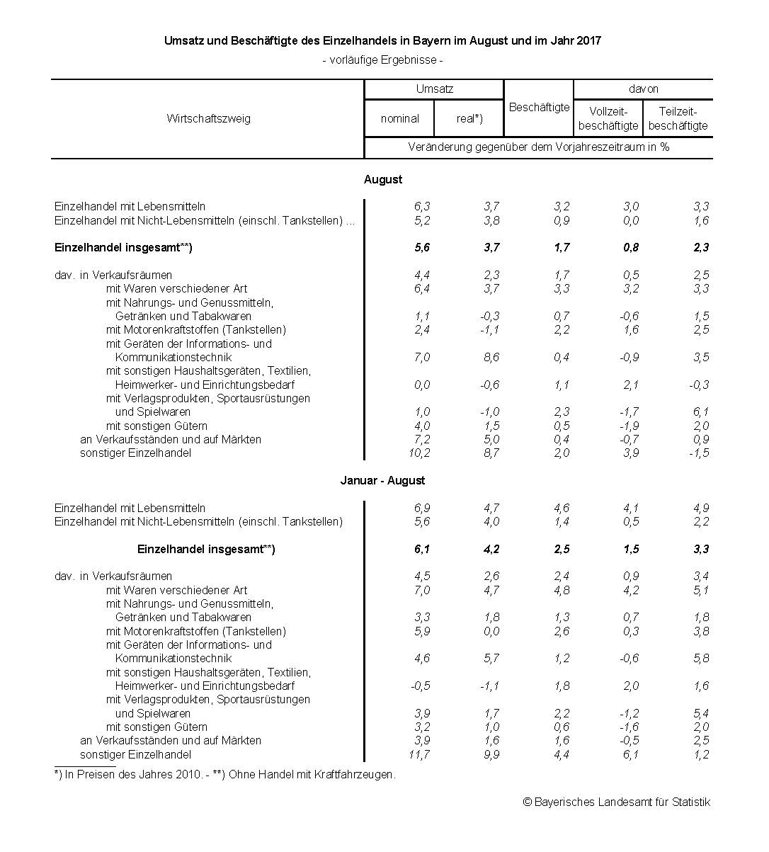 In den ersten acht Monaten 2017 wuchs der Umsatz des bayerischen Einzelhandels gegenüber dem Vorjahreszeitraum nominal um 6,1 Prozent, nach Preisbereinigung waren es noch 4,2 Prozent mehr. Die Zahl der Beschäftigten erhöhte sich um 2,5 Prozent.