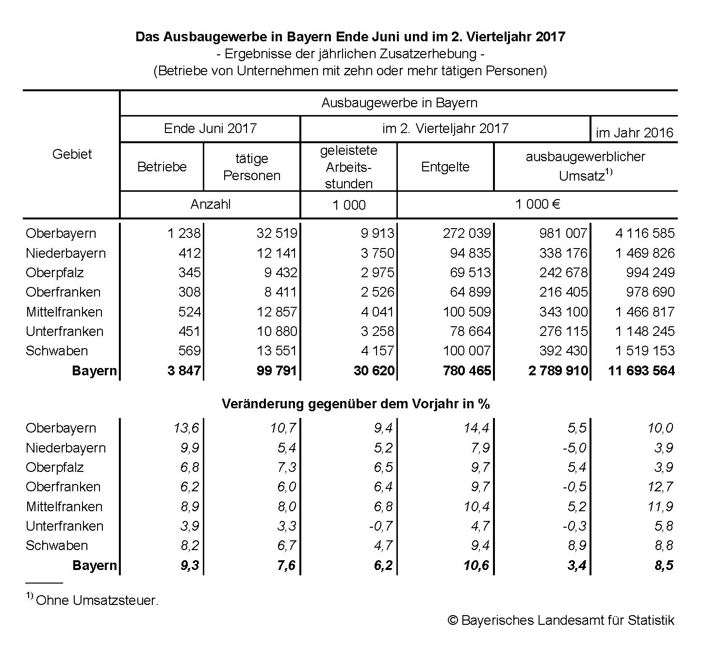 Im Vergleich mit den Ergebnissen im zweiten Vierteljahr 2016 verzeichneten die Betriebe auf Ebene der Regierungsbezirke im Mittel dagegen entweder Umsatzeinbußen (Niederbayern, Oberfranken und Unterfranken) oder Umsatzsteigerungen zwischen 5,2 Prozent (Mittelfranken) und 8,9 Prozent (Schwaben).