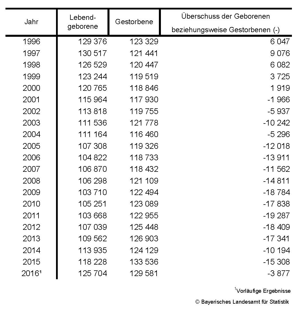 Im gleichen Zeitraum verstarben in Bayern etwa 129 580 Menschen, was einem Rückgang von circa 4 000 Sterbefällen (-3,0 Prozent) gegenüber dem Vorjahr 2015 entspricht (2015: 133 536 Verstorbene). Somit liegt zwar noch immer ein Überschuss der Sterbefälle über die Zahl der Geborenen vor, dieser befand sich aber im vergangenen Jahr auf dem niedrigsten Niveau seit 2001.