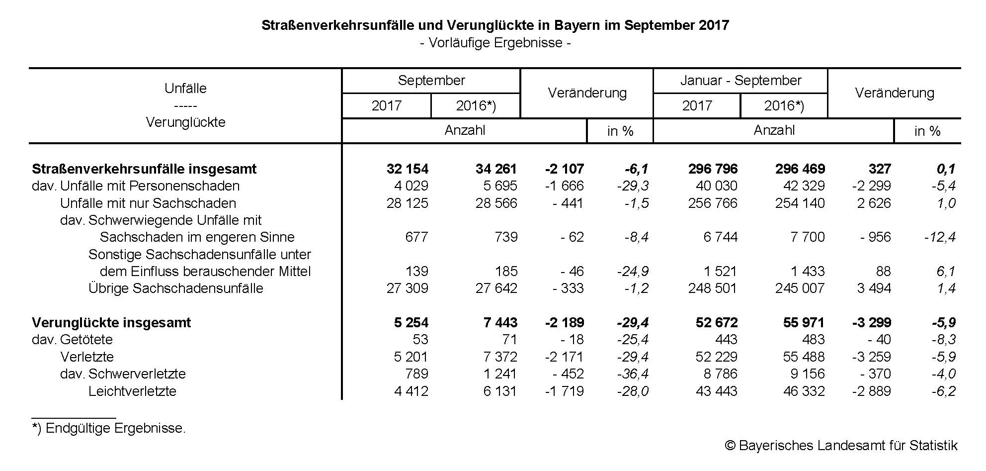 Nach den vorläufigen Meldungen der Polizei ereigneten sich auf Bayerns Straßen im September 2017 insgesamt 32 154 Unfälle. Das waren 6,1 Prozent weniger als im Vorjahresmonat. Nach Mitteilung des Bayerischen Landesamts für Statistik sank die Zahl der Unfälle mit Personenschaden um 29,3 Prozent, Sachschadensunfälle gingen um 1,5 Prozent zurück. – Im Zeitraum von Januar bis September 2017 ereigneten sich 296 796 Unfälle und damit 0,1 Prozent mehr als im Vorjahreszeitraum. Die Anzahl der Verunglückten sank im Vergleichszeitraum um 5,9 Prozent.