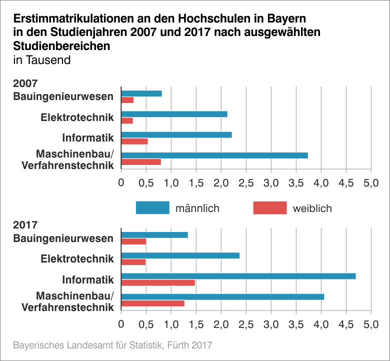 Der Bereich Informatik hat sich im Studienjahr 2017 mit 6 176 Erstimmatrikulierten im Vergleich zum Studienjahr 2016 um +3,1 Prozent verändert, der Bereich Maschinenbau/Verfahrenstechnik mit 5 335 Ersteinschreibungen um -7,6 Prozent. In der Elektro- und Informationstechnik haben sich 2 867 (+4,9 Prozent ggü. Studienjahr 2016) Studierende erstmalig eingeschrieben, im Bauingenieurwesen 1 847 (-2,3 Prozent ggü. Studienjahr 2016).