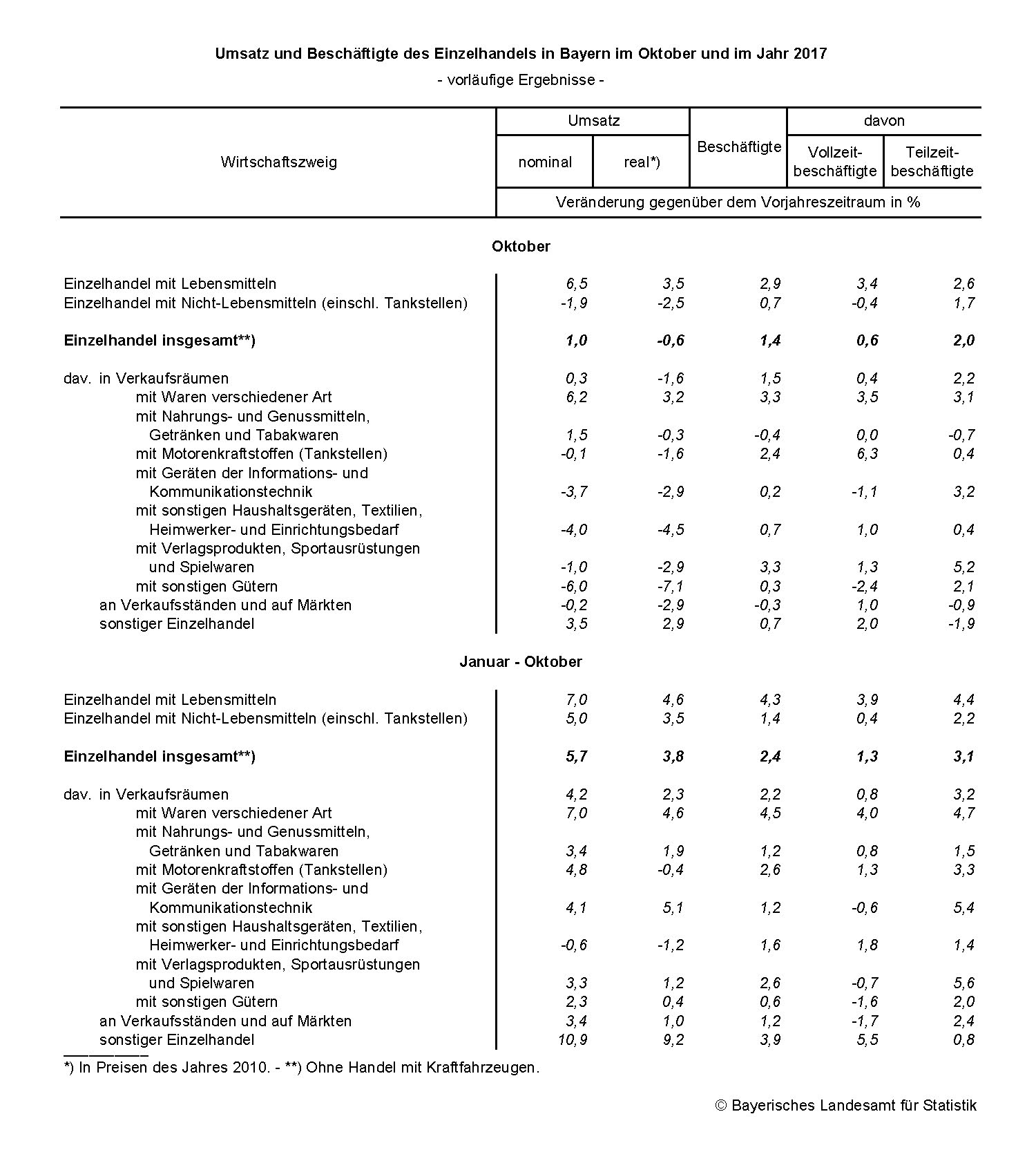 Wie das Bayerische Landesamt für Statistik nach ersten Ergebnissen der Monats-statistik im Einzelhandel berichtet, erhöhte sich der nominale Umsatz im bayerischen Einzelhandel (ohne Kraftfahrzeughandel) im Oktober 2017 im Vergleich zum Vorjahresmonat nominal um 1,0 Prozent, der reale Umsatz sank hingegen um 0,6 Prozent. Die Zahl der Beschäftigten des Einzelhandels stieg um 1,4 Prozent; dabei nahm die Zahl der Vollzeitbeschäftigten um 0,6 Prozent zu und die Zahl der Teilzeitbeschäftigten um 2,0 Prozent.