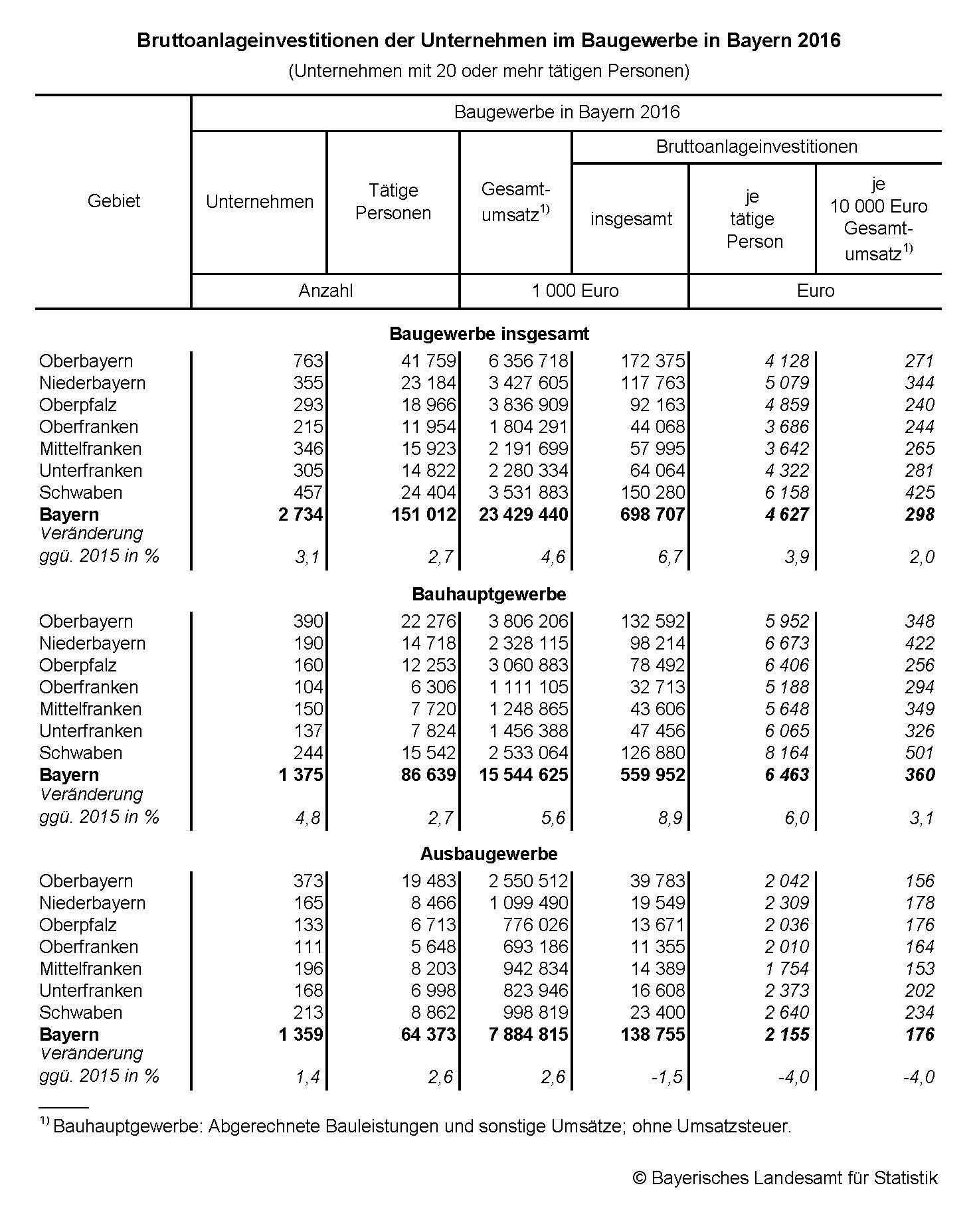 Von der gesamten Investitionssumme im bayerischen Baugewerbe 2016 sind rund 560,0 Millionen Euro bzw. 80,1 Prozent den Unternehmen im Bauhauptgewerbe zuzurechnen. In diesem Wirtschaftsbereich beliefen sich die Bruttoanlageinvestitionen je tätige Person auf 6 463 Euro und je 10 000 Euro Gesamtumsatz auf 360 Euro, womit der Wirtschaftssektor seine Investitionsintensität feststellbar gesteigert hat. Die Vergleichswerte 2015 lagen mit 6 097 Euro bzw. 349 Euro niedriger.