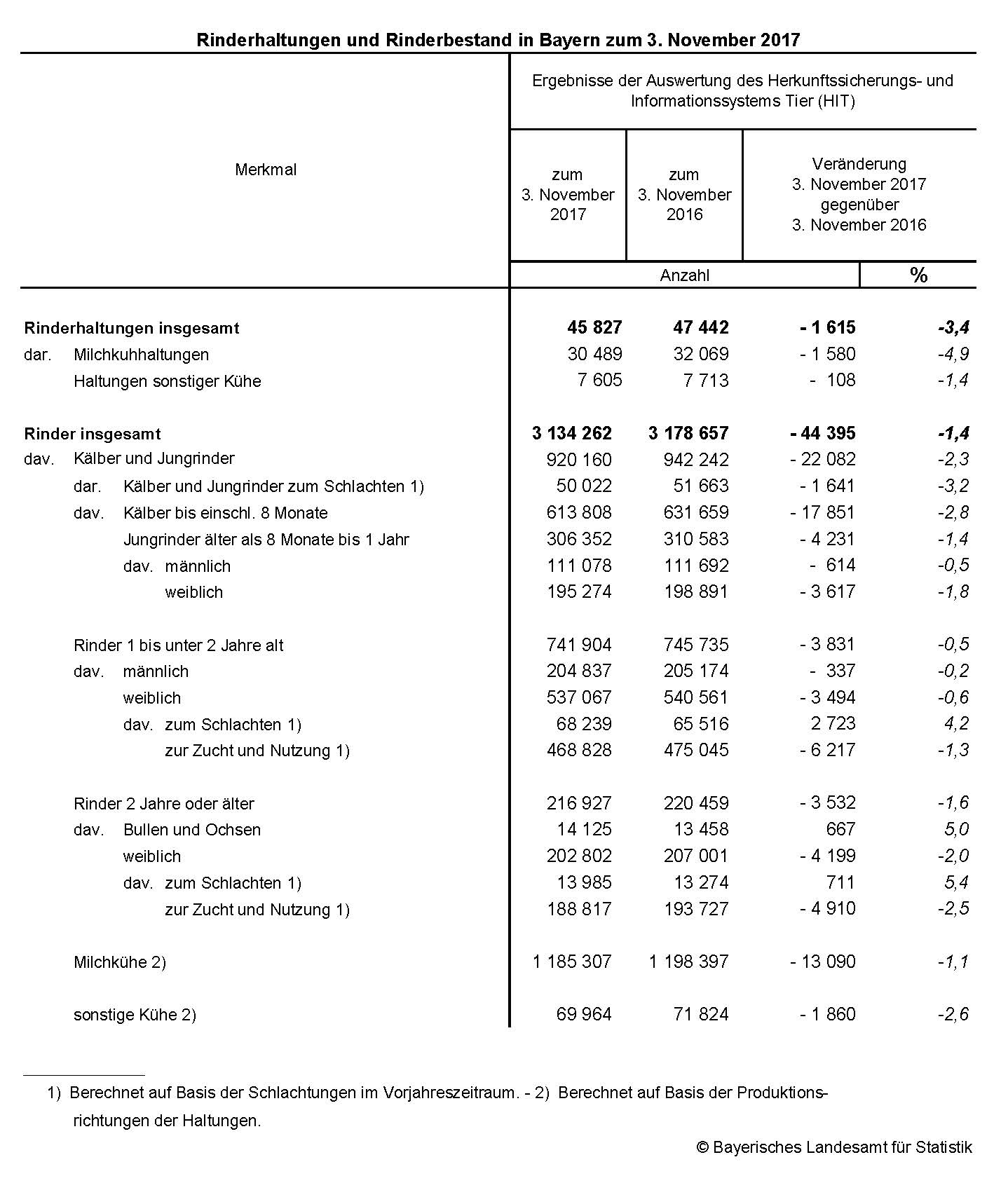 Zum Stichtag 3. November 2017 weist das Bayerische Landesamt für Statistik durch eine Auswertung des Verwaltungsverfahrens „Herkunftssicherungs- und Informationssystem Tier (HIT)“ 3 134 262 Rinder in 45 827 Haltungen nach. Die Zahl der Rinderhaltungen ist damit im Vergleich zum Vorjahr um 3,4 Prozent (-1 615 Haltungen) gesunken. Der Rinderbestand verringerte sich um 1,4 Prozent (-44 395 Tiere). Die durchschnittliche Rinderzahl je Haltung lag im November 2017 bei 68 Rindern und damit um ein Rind höher als noch im Vorjahresmonat.