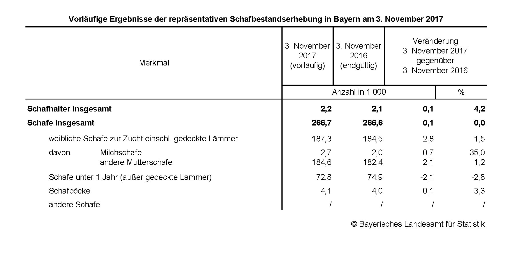 Nach den vorläufigen Ergebnissen der vom Bayerischen Landesamt für Statistik durchgeführten Schafbestandserhebung zum 3. November 2017 stieg die Anzahl der Schafhaltungsbetriebe auf 2 200. Dies entspricht einem Zuwachs von rund 4,2 Prozent. Der Schafbestand liegt mit 266 700 Tieren in etwa auf Vorjahresniveau.