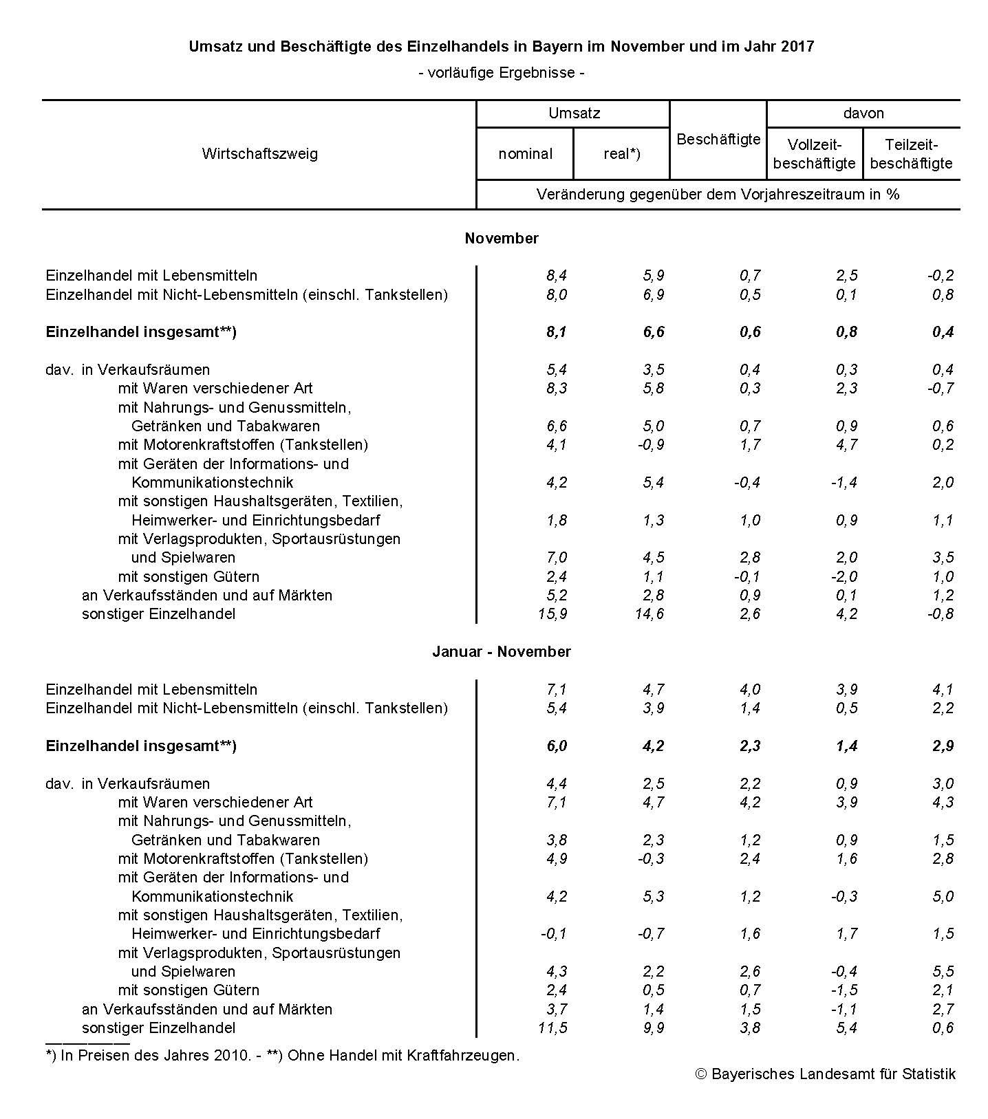 Nach den ersten Ergebnissen des Bayerischen Landesamts für Statistik stieg der Umsatz im bayerischen Einzelhandel im November 2017 gegenüber dem Vorjahresmonat nominal um 8,1 Prozent und real um 6,6 Prozent. Die Zahl der Beschäftigten erhöhte sich um 0,6 Prozent. – In den ersten elf Monaten 2017 nahm der Umsatz des bayerischen Einzelhandels im Vergleich zum Vorjahreszeitraum nominal um 6,0 Prozent und real um 4,2 Prozent zu.