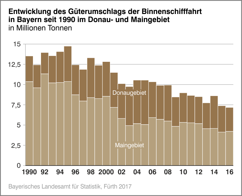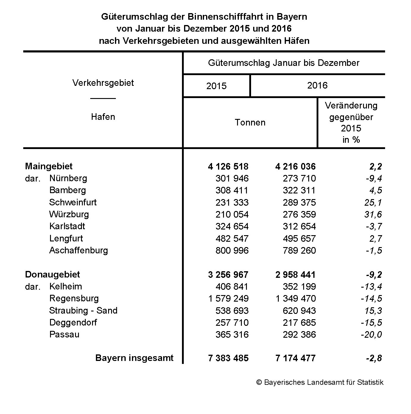 Wie das Bayerische Landesamt für Statistik mitteilt, lag der Güterumschlag der bayerischen Binnenschifffahrt im Jahr 2016 bei 7,17 Millionen Tonnen und damit 2,8 Prozent unter dem Stand des Vorjahres. Im Maingebiet wurden 4,22 Millionen Tonnen verladen (+2,2 Prozent) und im Donaugebiet 2,96 Millionen Tonnen (-9,2 Prozent). Die umschlagstärksten Häfen an der Donau waren Regensburg und Straubing-Sand, am Main waren es Aschaffenburg und Lengfurt. Es wurden hauptsächlich land- und forstwirtschaftliche Erzeugnisse sowie Erze, Steine und Erden zu Wasser transportiert.