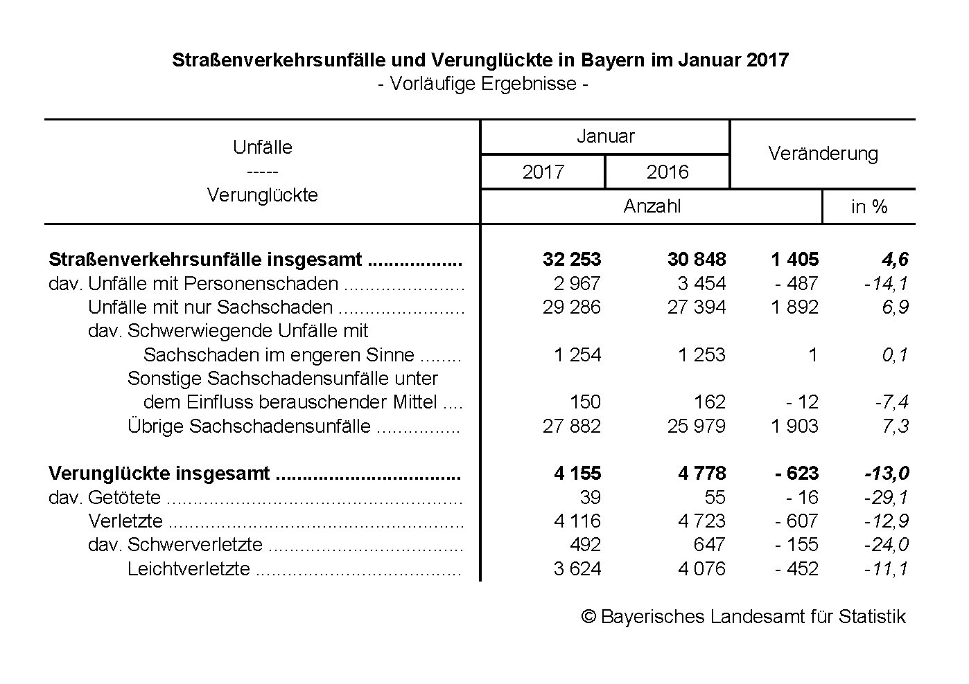Im Januar 2017 ereigneten sich auf Bayerns Straßen nach den vorläufigen Meldungen der Polizei insgesamt 32 253 Unfälle und somit 4,6 Prozent mehr als im Vorjahresmonat. Nach Mitteilung des Bayerischen Landesamts für Statistik sanken Unfälle mit Personenschaden um 14,1 Prozent, während Sachschadensunfälle um 6,9 Prozent zunahmen. Die Zahl der Verunglückten sank um 13,0 Prozent auf 4 155 Fälle insgesamt. Es wurden 39 Verkehrsteilnehmer getötet (-29,1 Prozent), 492 schwer (-24,0 Prozent) und 3 624 leicht verletzt (‑11,1 Prozent).