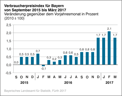 Nach Angaben des Bayerischen Landesamts für Statistik lag die Inflationsrate, das ist die Veränderung des Verbraucherpreisindex für Bayern gegenüber dem entsprechenden Vorjahresmonat in Prozent, im März 2017 bei +1,7 Prozent; im vorangegangenen Februar hatte sie bei +2,1 Prozent gelegen. Ohne Heizöl und Kraftstoffe gerechnet, hätte die Inflationsrate bei 1,1 Prozent gelegen.