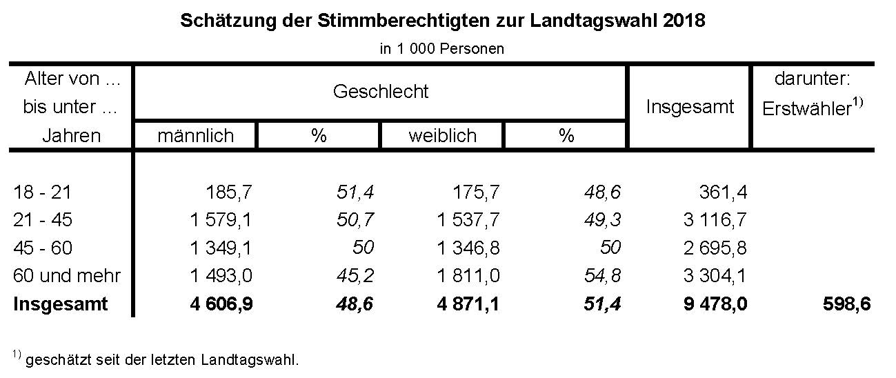 Bei der Landtagswahl am 14. Oktober 2018 werden nach einer Schätzung des Bayerischen Landesamts für Statistik rund 9 478 000 Personen in Bayern stimmberechtigt sein. Erstmals bei einer Landtagswahl abstimmen können rund 599 000 Bayern.