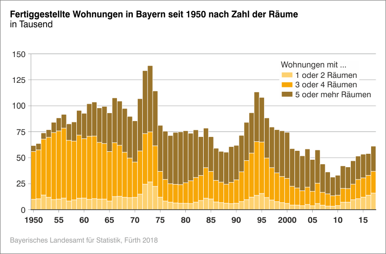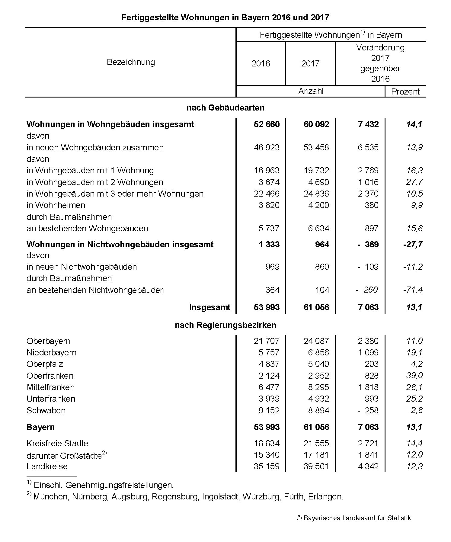 Nach Angaben des Bayerischen Landesamts für Statistik wurden im Rahmen der Baufertigstellungsstatistik 2017 von den unteren Bauaufsichtsbehörden in Bayern insgesamt 61 056 Wohnungsfertigstellungen gemeldet. Dies entspricht einem Plus an Wohnungsfertigstellungen von deutlichen 13,1 Prozent gegenüber 2016 (53 993 Wohnungen) und von immerhin 4,0 Prozent gegenüber 2001 (58 710 Wohnungen). Rein rechnerisch entstand somit binnen Jahresfrist 2017 eine Stadt, deren Wohnungszahl in etwa derjenigen der Stadt Erlangen zum Stand 31.12.2016 entspricht.