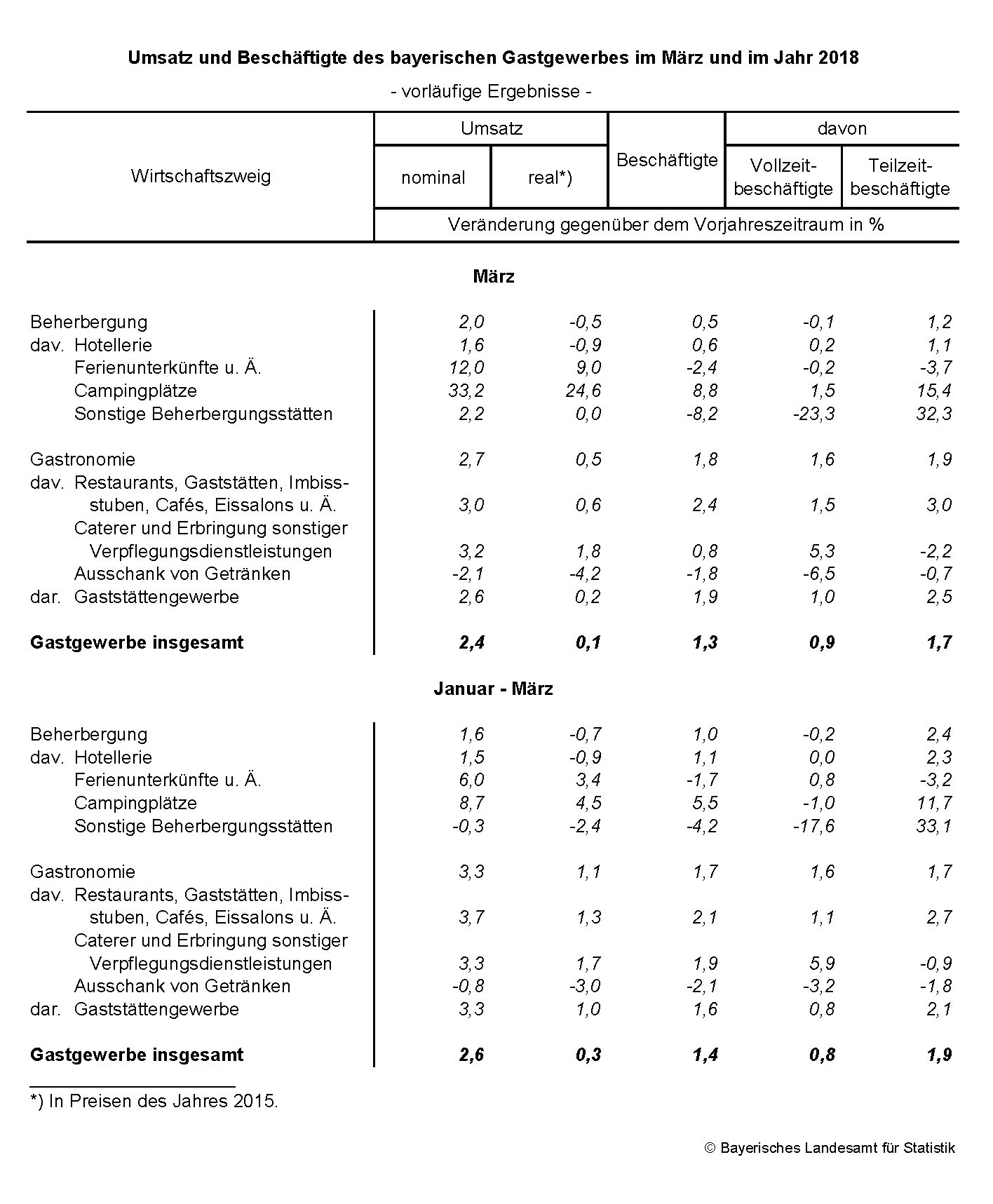 Nach vorläufigen Ergebnissen des Bayerischen Landesamts für Statistik wuchs der nominale Umsatz im bayerischen Gastgewerbe in den ersten drei Monaten 2018 gegenüber dem Vorjahreszeitraum um 2,6 Prozent, der reale Umsatz lag bei 0,3 Prozent im Plus. Die Zahl der Beschäftigten des Gastgewerbes stieg um 1,4 Prozent (Vollzeitbeschäftigte: 0,8 Prozent; Teilzeitbeschäftigte: 1,9 Prozent).