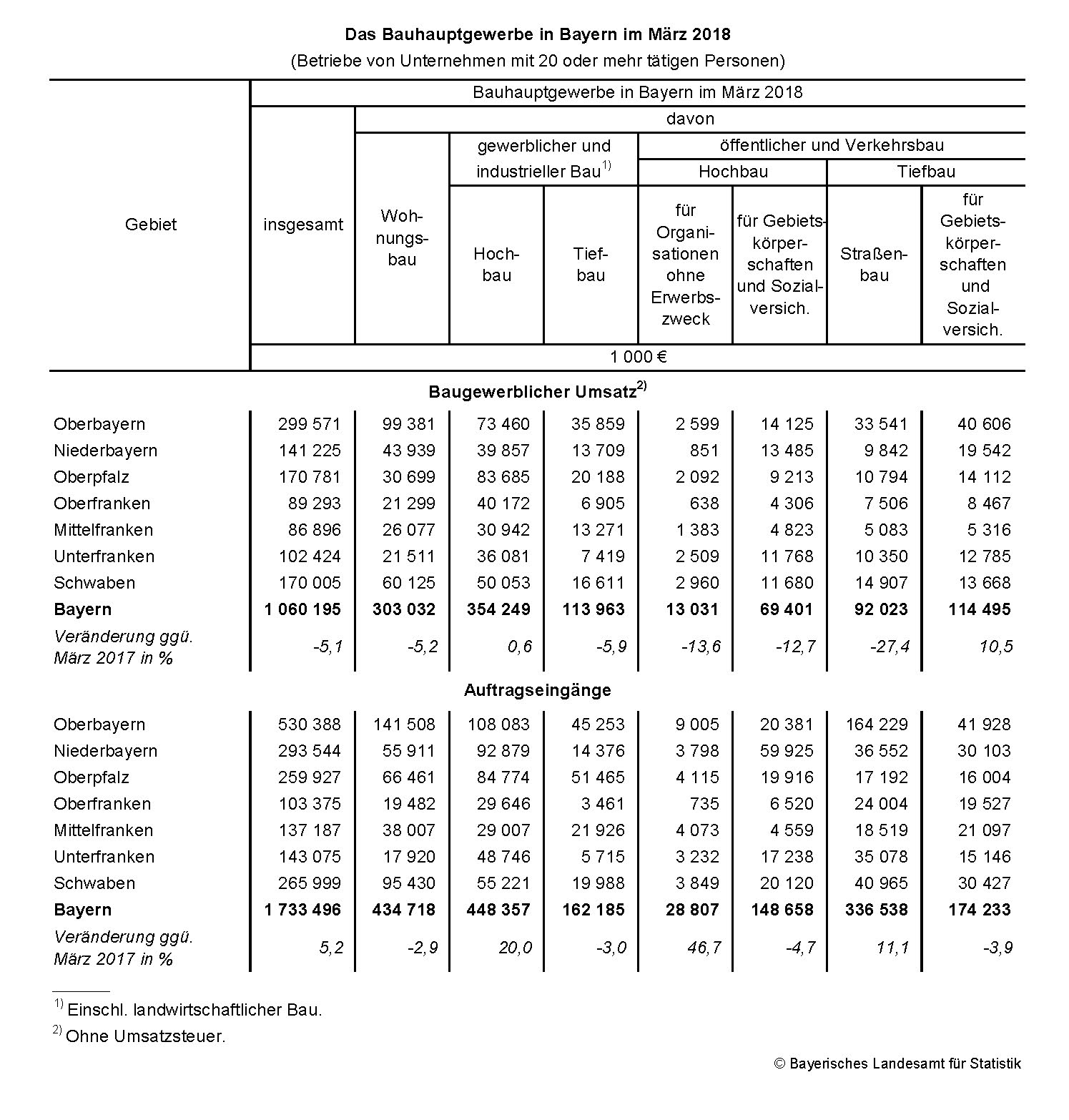 Das bayerische Bauhauptgewerbe erwirtschaftete im März 2018 einen baugewerblichen Umsatz in Höhe von 1,06 Milliarden Euro und damit ein Minus von 57,3 Millionen Euro bzw. 5,1 Prozent im Vergleich zum Vorjahresergebnis. Nach weiteren Angaben des Bayerischen Landesamts für Statistik haben regional betrachtet ausnahmslos alle Regierungsbezirke Bayerns zu diesem Umsatzrückgang beigetragen und fachlich gesehen mit Ausnahme des gewerblichen und industriellen Hochbaus sowie des Tiefbaus für Gebietskörperschaften und Sozialversicherungen (+0,6 Prozent bzw. +10,5 Prozent gegenüber März 2017) auch alle Bausparten. Die Auftragseingänge im Wirtschaftssektor veränderten sich gegenüber März 2017 dagegen positiv auf den aktuellen Gesamtwert von 1,73 Milliarden Euro (+5,2 Prozent) und der Personalstand wuchs auf insgesamt 88 488 tätige Personen an (+3,2 Prozent).