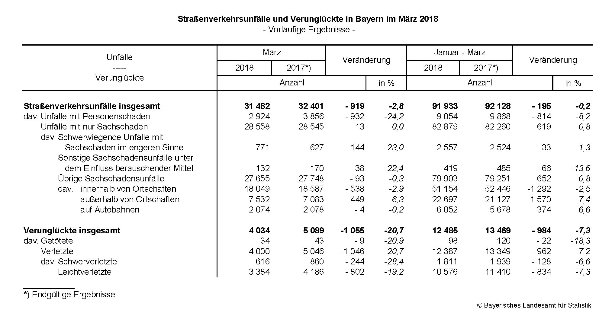 Im März 2018 ereigneten sich auf Bayerns Straßen nach den vorläufigen Meldungen der Polizei insgesamt 31 482 Unfälle und somit 2,8 Prozent weniger als im Vorjahresmonat. Nach Mitteilung des Bayerischen Landesamts für Statistik sanken Unfälle mit Personenschaden um 24,2 Prozent, Unfälle mit nur Sachschaden blieben annähernd gleich. Im Zeitraum von Januar bis März 2018 ereigneten sich 91 933 Unfälle und damit 0,2 Prozent weniger als im Vorjahreszeitraum. Die Zahl der Verunglückten sank im Vergleichszeitraum um 7,3 Prozent.
