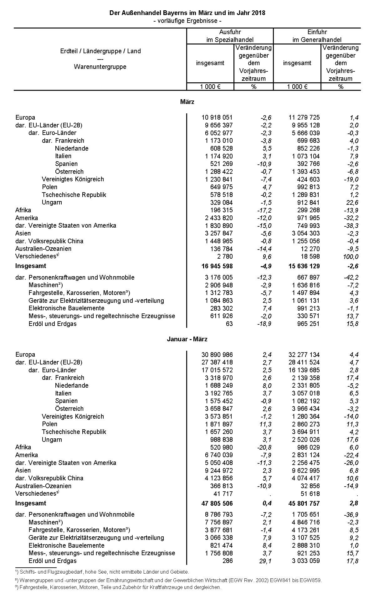 Nach den vorläufigen Ergebnissen des Bayerischen Landesamts für Statistik exportierte die bayerische Wirtschaft in den ersten drei Monaten 2018 Waren im Wert von 47,8 Milliarden Euro, 0,4 Prozent mehr als im Vorjahreszeitraum. Zeitgleich importierte sie Waren im Wert von 45,8 Milliarden Euro (+2,8 Prozent). - Im März 2018 gingen die Ausfuhren der bayerischen Wirtschaft gegenüber dem Vorjahreszeitraum um 4,9 Prozent auf 16,9 Milliarden Euro zurück, die Einfuhren sanken um 2,6 Prozent auf 15,6 Milliarden Euro.