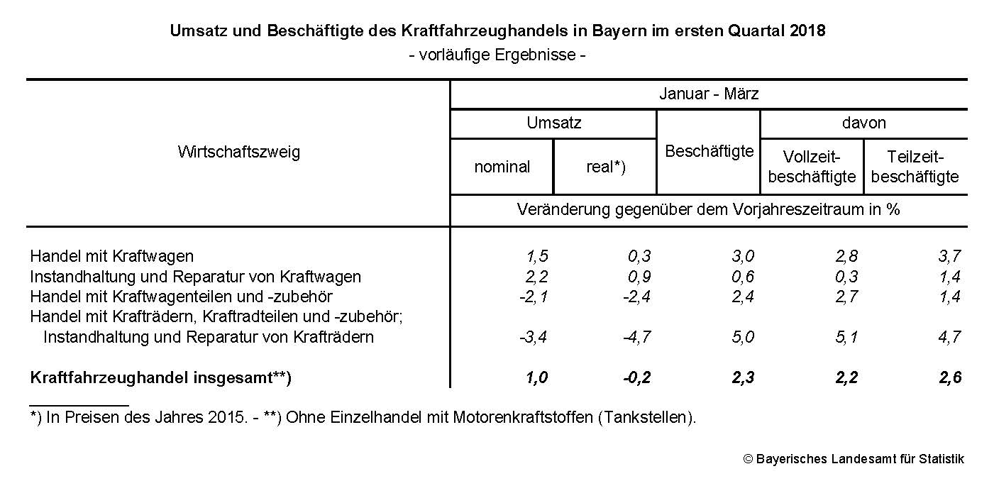 Nach einer Mitteilung des Bayerischen Landesamts für Statistik stieg der Umsatz im bayerischen Kraftfahrzeughandel im ersten Quartal 2018 im Vergleich zum Vorjahreszeitraum nominal um 1,0 Prozent; nach Preisbereinigung sank der Umsatz jedoch leicht (-0,2 Prozent). Die Zahl der Beschäftigten erhöhte sich um 2,3 Prozent (Vollzeitbeschäftigte: +2,2 Prozent; Teilzeitbeschäftigte: +2,6 Prozent).