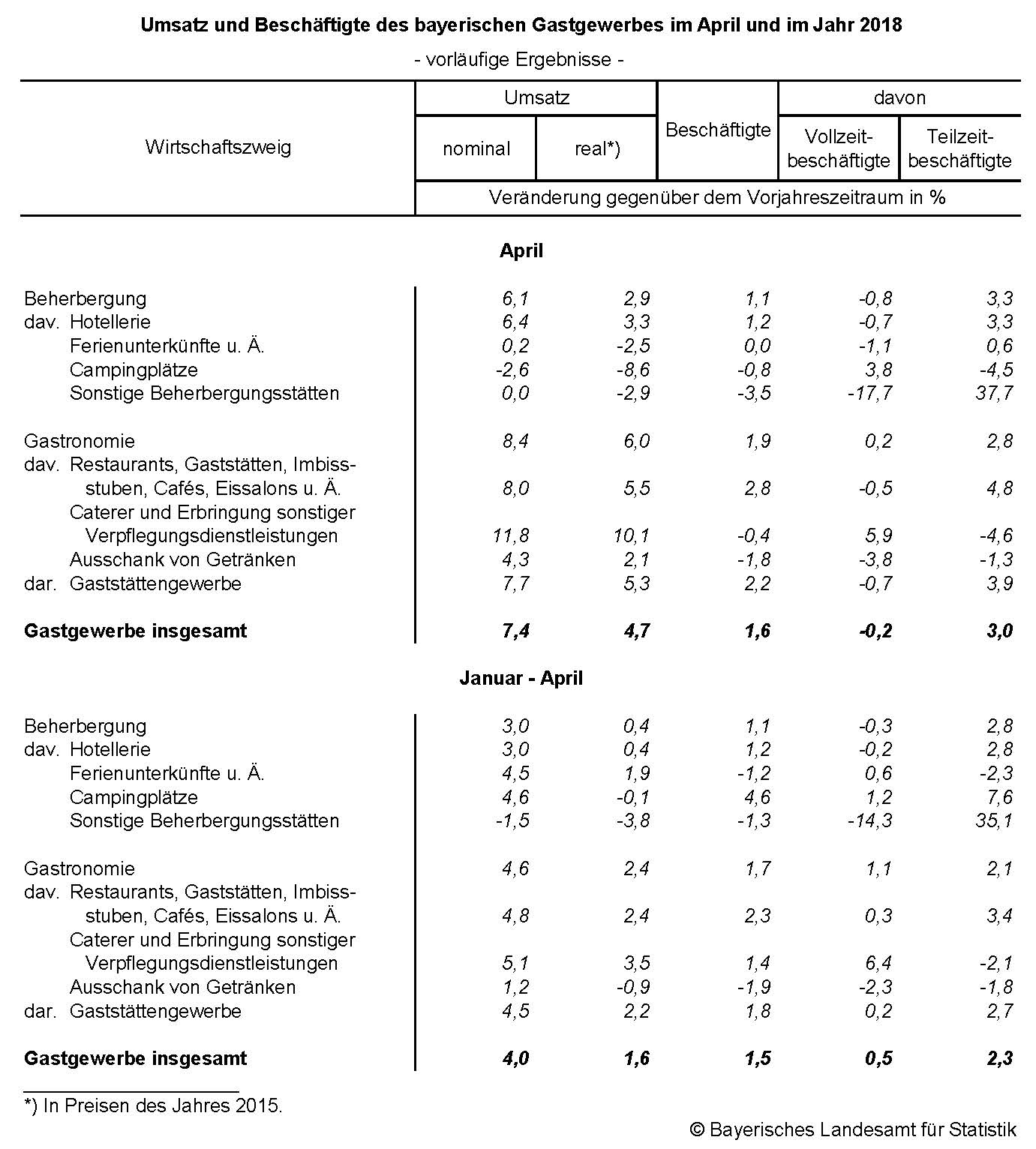Wie das Bayerische Landesamt für Statistik nach vorläufigen Ergebnissen der Monatsstatistik im Gastgewerbe mitteilt, wuchs der Umsatz im bayerischen Gastgewerbe im April 2018 gegenüber dem Vorjahresmonat nominal um 7,4 Prozent und preisbereinigt um 4,7 Prozent. Die Zahl der Beschäftigten nahm um 1,6 Prozent zu. – In den ersten vier Monaten 2018 stieg der nominale Umsatz des Gastgewerbes gegenüber dem Vorjahreszeitraum um 4,0 Prozent und der preisbereinigte Umsatz um 1,6 Prozent.