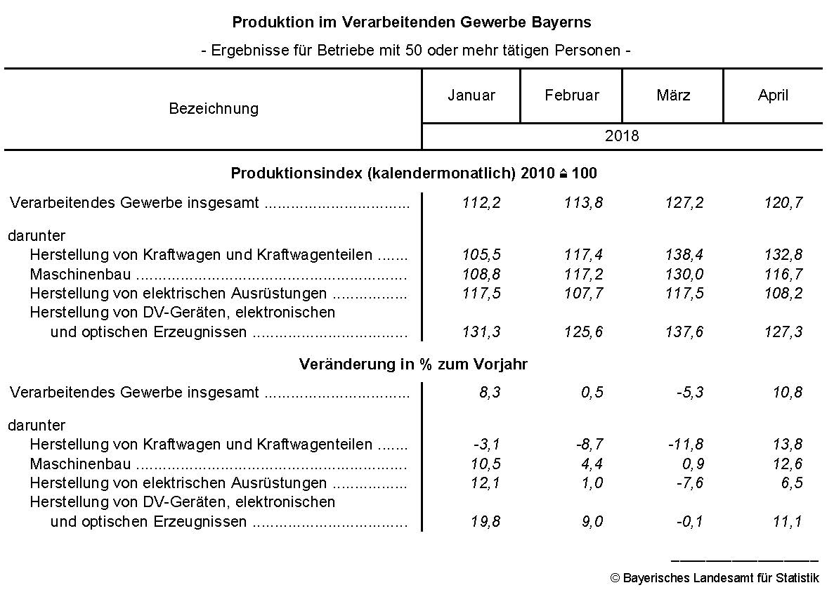 Nach Angaben des Bayerischen Landesamts für Statistik konnte die Produktion des Verarbeitenden Gewerbes im April 2018 gegenüber dem Vorjahresergebnis eine Zunahme von 10,8 Prozent verzeichnen. Die ersten vier Monate des Jahres 2018 erbrachten ein Plus von 3,0 Prozent.