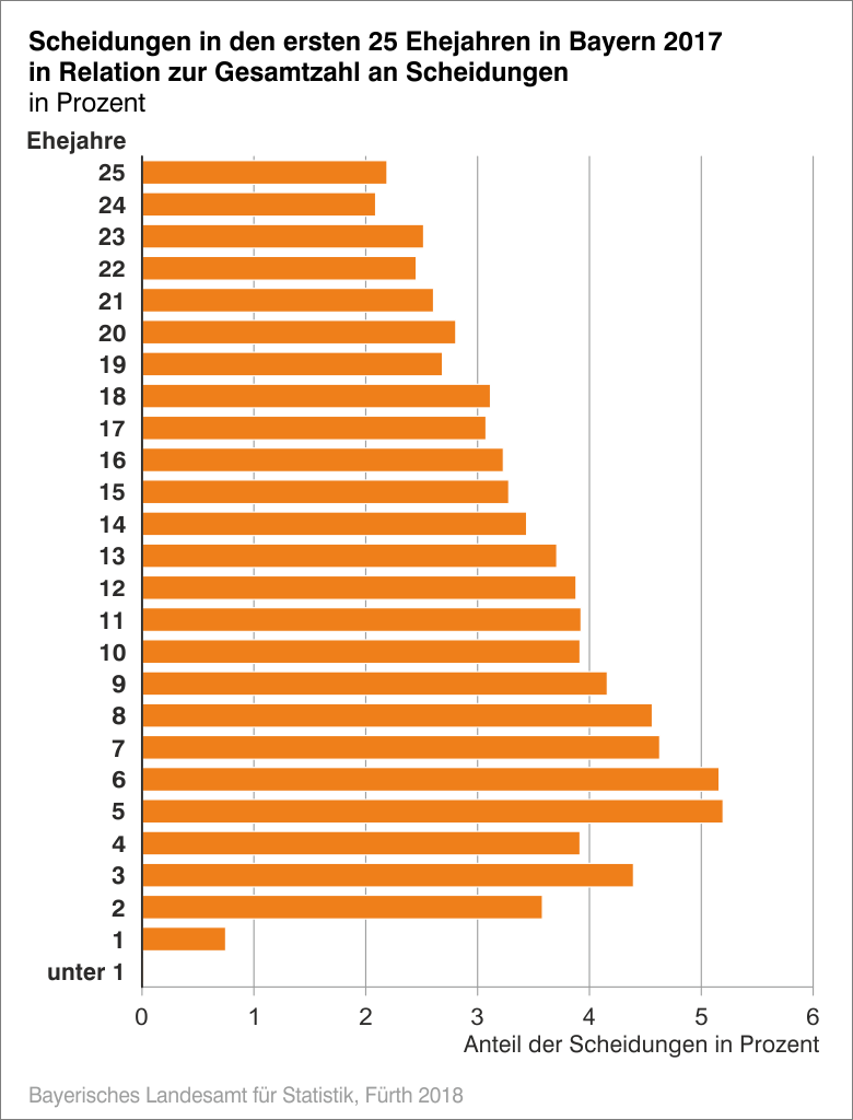 Verhältnismäßig viele Ehen wurden in Bayern im Jahr 2017 zwischen dem fünften und achten Ehejahr geschieden. Am häufigsten von einer Scheidung betroffen waren Ehen mit einer Ehedauer von fünf Jahren. Nach dieser Ehedauer wurden 1 174 Ehen geschieden, was 5,2 Prozent der gesamten gerichtlichen Ehelösungen entspricht. Ein Anteil von rund 17 Prozent der geschiedenen Paare (3 824) hatten bei ihrer Scheidung bereits mehr als 24 Ehejahre miteinander verbracht. Die durchschnittliche Ehedauer im Scheidungsfall lag im Jahr 2017 bei 14,3 Jahren.