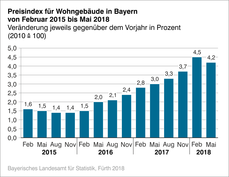 Wie das Bayerische Landesamt für Statistik mitteilt, erreichte der Preisindex für den Neubau von Wohngebäuden in Bayern im Mai 2018 einen Stand von 122,0 (2010≙100). Im Vergleich zum entsprechenden Vorjahresmonat bedeutet dies eine durchschnittliche Preissteigerung von 4,2 Prozent.