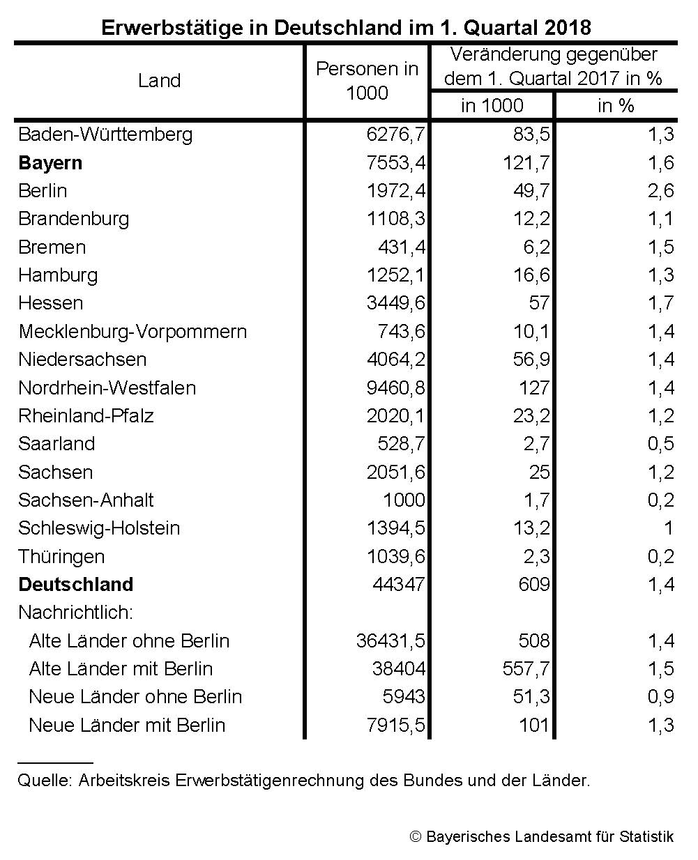 Die Erwerbstätigkeit stieg in Bayern im Vergleich zu den anderen Bundesländern überdurchschnittlich an. Deutschlandweit betrug die Zunahme 1,4 Prozent. Auf diesen Wert kamen auch die alten Bundesländer (ohne Berlin), während die Beschäftigung in den neuen Bundesländern (ohne Berlin) lediglich um 0,9 Prozent zulegte.