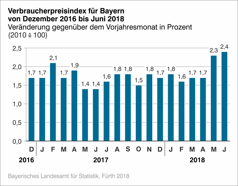 Nach Angaben des Bayerischen Landesamts für Statistik lag die Inflationsrate, das ist die Veränderung des Verbraucherpreisindex für Bayern gegenüber dem entsprechenden Vorjahresmonat in Prozent, im Juni 2018 bei +2,4 Prozent; im vorangegangenen Mai hatte sie bei +2,3 Prozent gelegen. Ohne Heizöl und Kraftstoffe gerechnet, läge die Inflationsrate bei +1,8 Prozent.