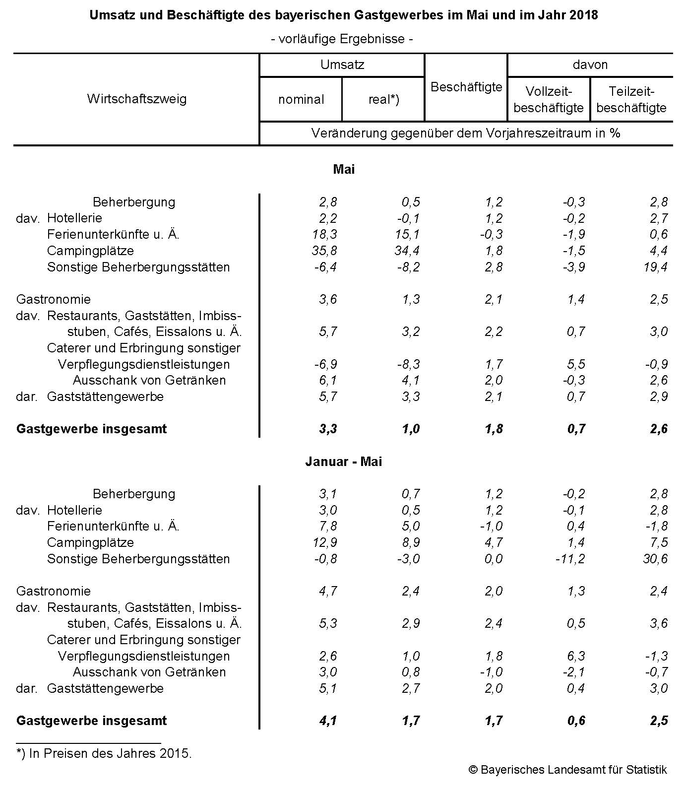 Nach den im Bayerischen Landesamt für Statistik vorliegenden, vorläufigen Ergebnissen der Monatsstatistik im Gastgewerbe erhöhte sich der Umsatz im bayerischen Gastgewerbe im Mai 2018 gegenüber dem Vorjahresmonat nominal um 3,3 Prozent und real um 1,0 Prozent. Die Zahl der Beschäftigten des Gastgewerbes stieg um 1,8 Prozent, davon nahm die Zahl der Vollzeitbeschäftigten um 0,7 Prozent zu und die Zahl der Teilzeitbeschäftigten um 2,6 Prozent.