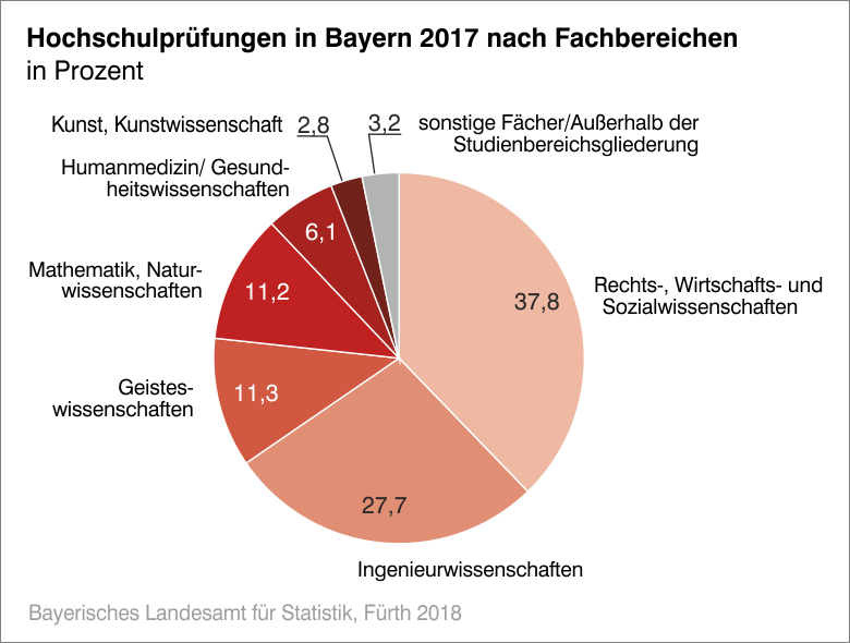 Wie das Bayerische Landesamt für Statistik nach noch vorläufigen Ergebnissen mitteilt, wurden im Prüfungsjahr 2017 an Bayerns Hochschulen insgesamt 80 083 Abschlussprüfungen erfolgreich abgelegt. Damit meldeten die Prüfungskanzleien 1,7 Prozent mehr bestandene Prüfungen als in der Vorperiode. Mit dem erfolgreichen Abschluss der Promotion erwarben 1 914 Akademikerinnen und 2 556 Akademiker einen Doktortitel.