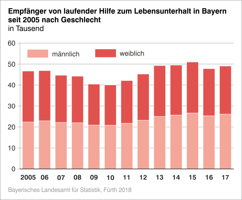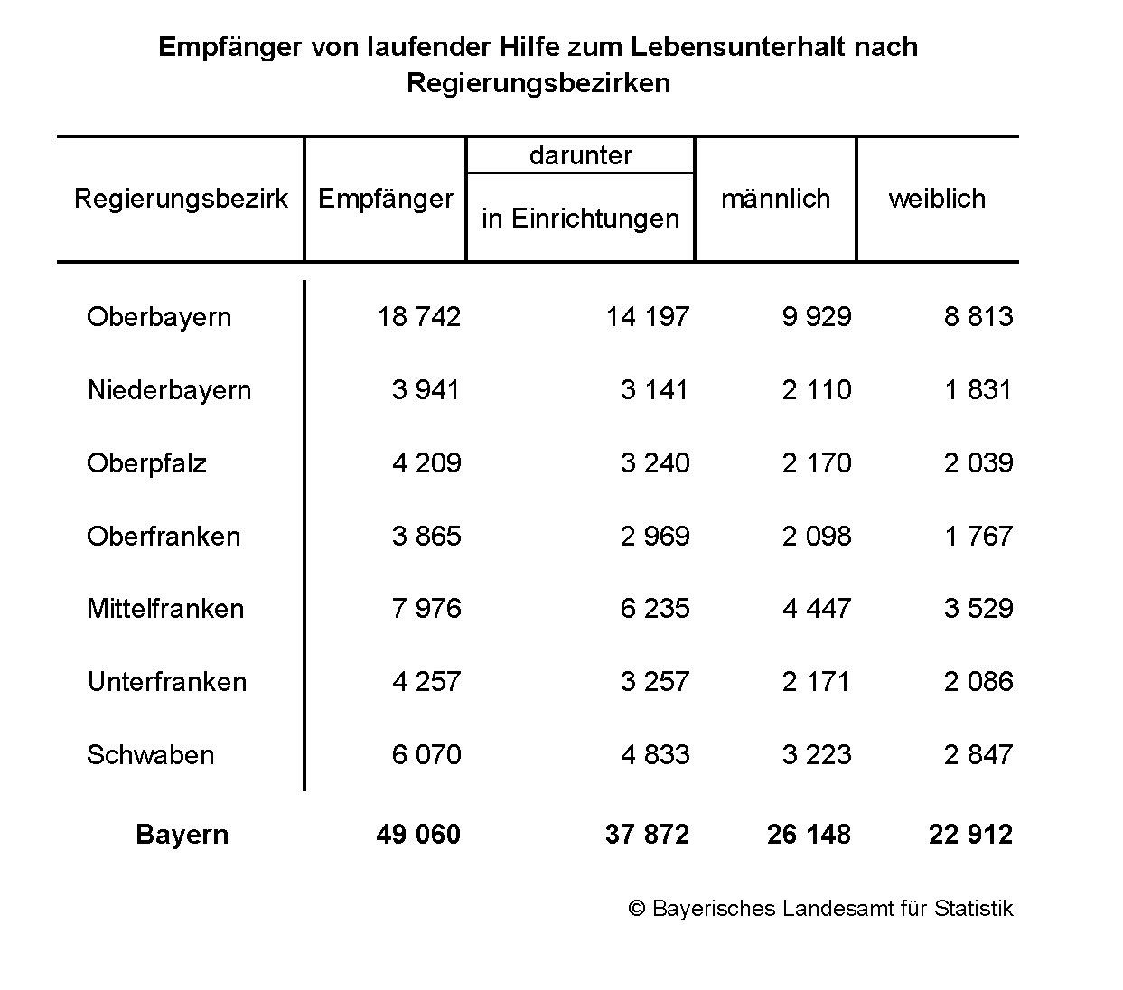 Zum Jahresende 2017 waren in Bayern insgesamt 49 060 Menschen auf Leistungen im Rahmen der Hilfe zum Lebensunterhalt angewiesen. Das entspricht nach Angaben des Bayerischen Landesamts für Statistik einem Plus von 2,6 Prozent gegenüber dem Vorjahr (47 797 Empfänger). Hilfebedürftig waren 26 148 Männer und 22 912 Frauen, die Mehrzahl der Hilfeempfänger (37 872) lebte in einer Einrichtung wie einem Wohn - oder Pflegeheim.