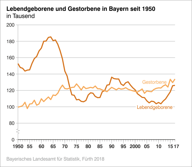 In Bayern ist die Zahl der Lebendgeborenen im Jahr 2017 gegenüber dem Vorjahr um 0,4 Prozent auf 126 191 angestiegen. Die Zahl der Verstorbenen stieg im gleichen Zeitraum um 3,4 Prozent, auf 133 902 Sterbefälle. Von Anfang Januar bis Ende Dezember 2017 kamen im Freistaat damit 7 711 Kinder weniger zur Welt als Menschen verstarben. Wie das Bayerische Landesamt für Statistik weiterhin mitteilt, konnten im regionalen Vergleich die Regierungs-bezirke Oberfranken und Oberpfalz, mit je einem Plus von ca. 1,7 Prozent, die höchste Zunahme an Geburten im Vergleich zum Vorjahr verzeichnen.