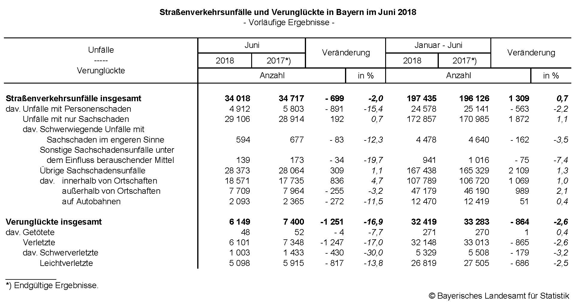 Nach den vorläufigen Meldungen der Polizei ereigneten sich im Juni 2018 auf Bayerns Straßen insgesamt 34 018 Unfälle. Das waren 2,0 Prozent weniger als im Vorjahresmonat. Nach Mitteilung des Bayerischen Landesamts für Statistik gingen Unfälle mit Personenschaden um 15,4 Prozent zurück; die Sachschadensunfälle stiegen leicht um 0,7 Prozent. Die Zahl der Verunglückten sank im Vergleich zum Juni 2017 um 16,9 Prozent.