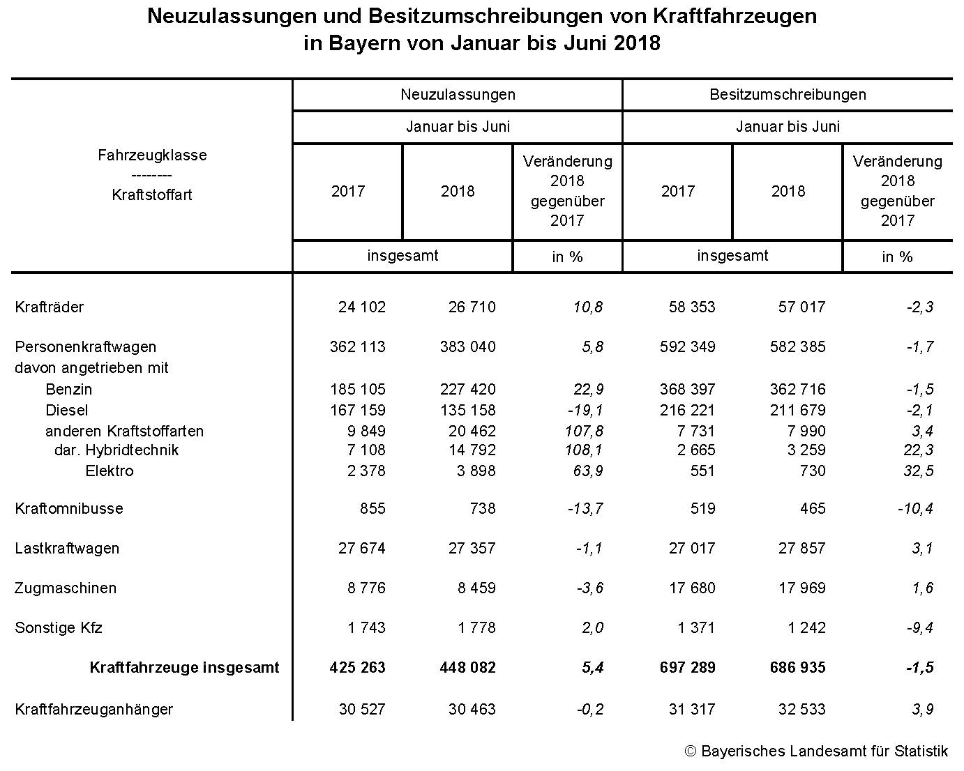 Neuzulassungen und Besitzumschreibungen von Kraftfahrzeugen in Bayern von Januar bis Juni 2018