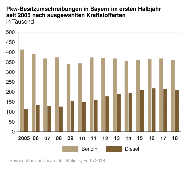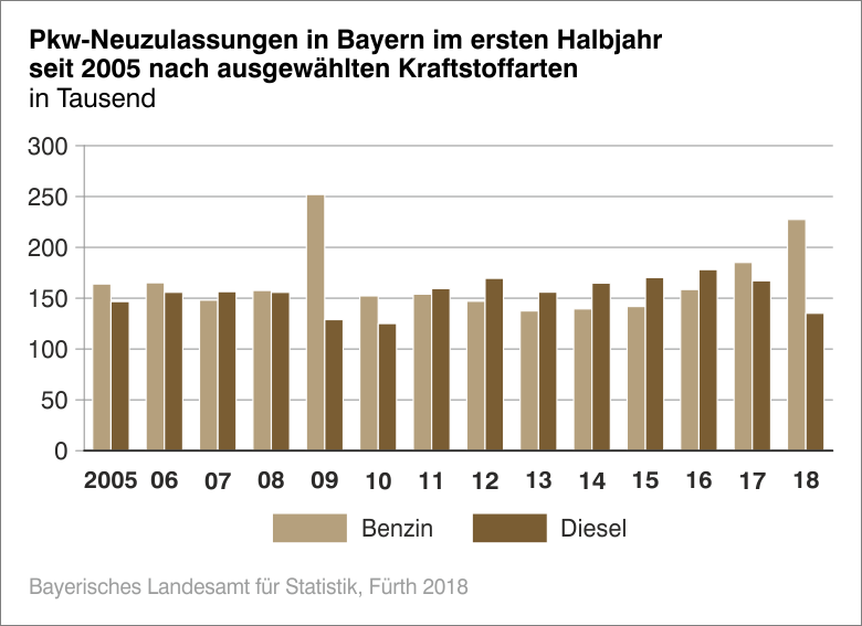 Nach der aktuellen Auswertung der Statistik des Kraftfahrt-Bundesamtes wurden im ersten Halbjahr 2018 in Bayern 448 082 Kraftfahrzeuge (Kfz) neu zugelassen. Das waren 5,4 Prozent mehr als im Vorjahreszeitraum. Wie das Bayerische Landesamt für Statistik weiter mitteilt, nahmen die Zulassungszahlen von Personenkraftwagen (Pkw) auf 383 040 zu. Die Neuzulassungen von Benzinern stiegen um 22,9 Prozent auf 227 420, Diesel-Pkw hingegen sanken um 19,1 Prozent auf 135 158. Besonders stark um 107,8 Prozent auf 20 462 Fahrzeuge stiegen andere Kraftstoffarten (Gas, Elektro, Hybrid), die einen Anteil von 5,3 Prozent an allen neu zugelassenen Pkw ausmachten. – Besitzumschreibungen sanken um 1,5 Prozent auf 686 935 Kfz.