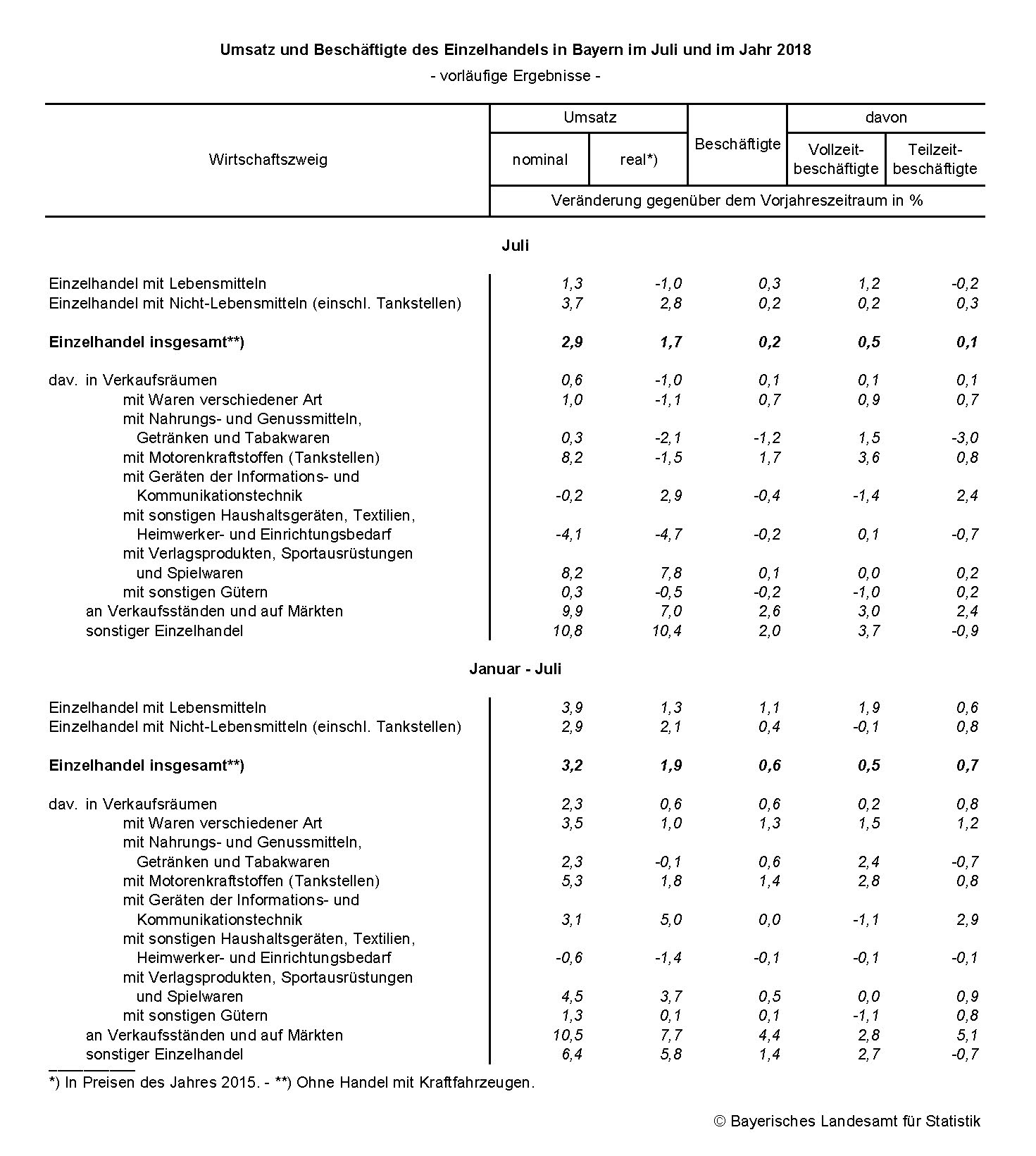 Von Januar bis Juli 2018 nahm der nominale Umsatz des bayerischen Einzelhandels gegenüber dem Vorjahreszeitraum um 3,2 Prozent zu (real: +1,9 Prozent); die Zahl der Beschäftigten erhöhte sich um 0,6 Prozent.