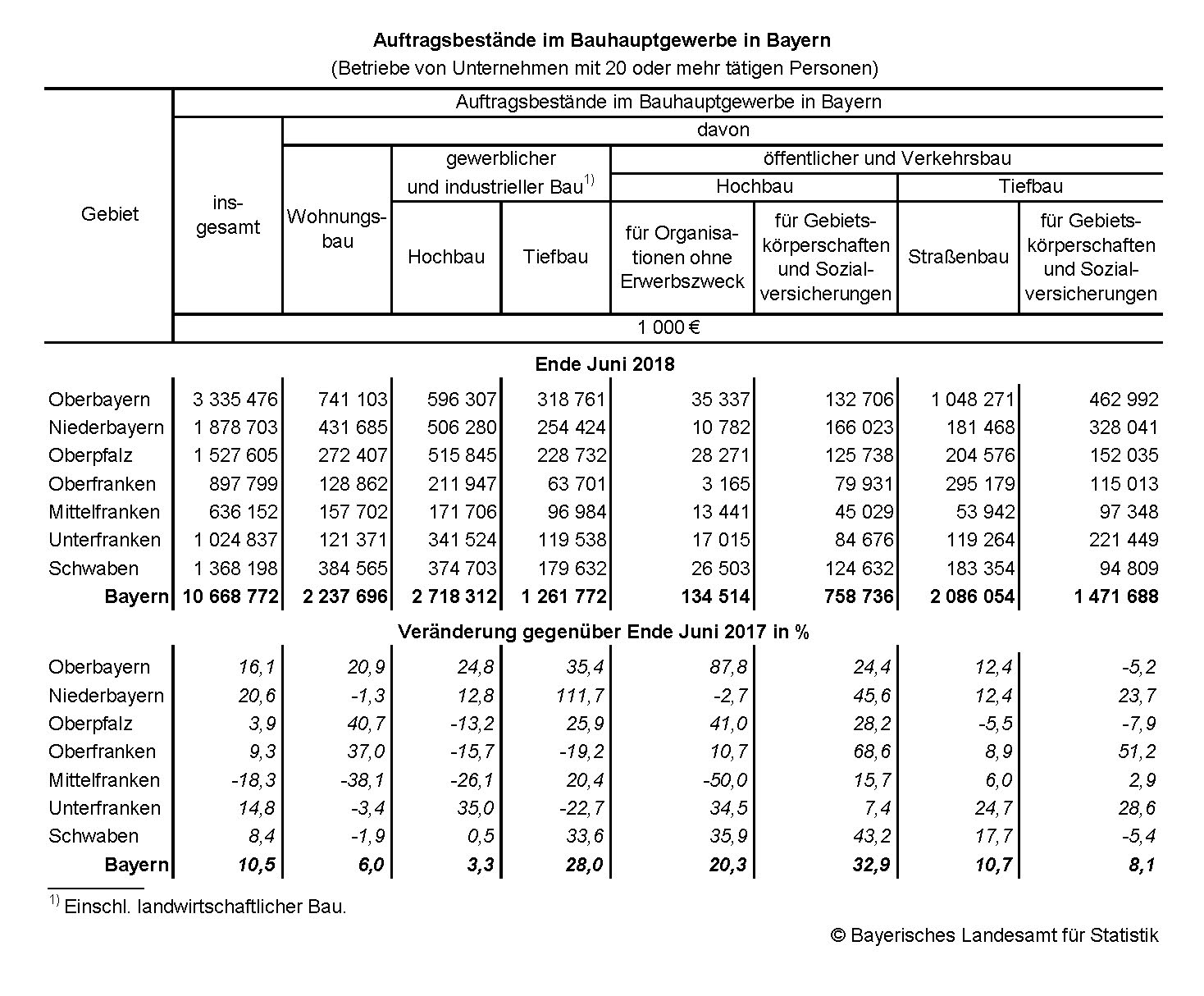 Nach Angaben des Bayerischen Landesamts für Statistik belief sich der Auftragsbestand im Bauhauptgewerbe Ende Juni 2018 auf insgesamt 10,67 Milliarden Euro. Der vergleichbare Vorjahreswert wurde damit um 1,01 Milliarden Euro bzw. 10,5 Prozent übertroffen.