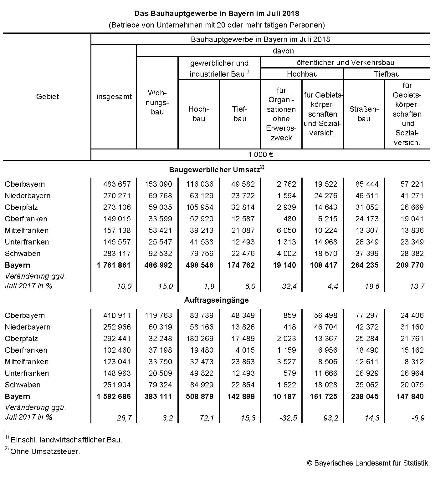 Im Juli 2018 erzielte das Bauhauptgewerbe in Bayern einen baugewerblichen Umsatz von insgesamt 1,76 Milliarden Euro. Nach Angaben des Bayerischen Landesamts für Statistik wurde damit das entsprechende Vorjahresergebnis um 160,6 Millionen Euro bzw. 10,0 Prozent übertroffen, wobei alle Bausparten zum Plus beigetragen haben. Die Auftragseingänge im bayerischen Bauhauptgewerbe beliefen sich im aktuellen Berichtsmonat auf einen Gesamtwert von 1,59 Milliarden Euro und der gesamte Personalstand Ende Juli 2018 auf 92 784 tätige Personen (+26,7 Prozent bzw. +4,1 Prozent). Gearbeitet wurden insgesamt 10,8 Millionen Stunden und an Entgelten insgesamt 325,6 Millionen Euro gezahlt (+9,3 Prozent bzw. +12,1 Prozent).