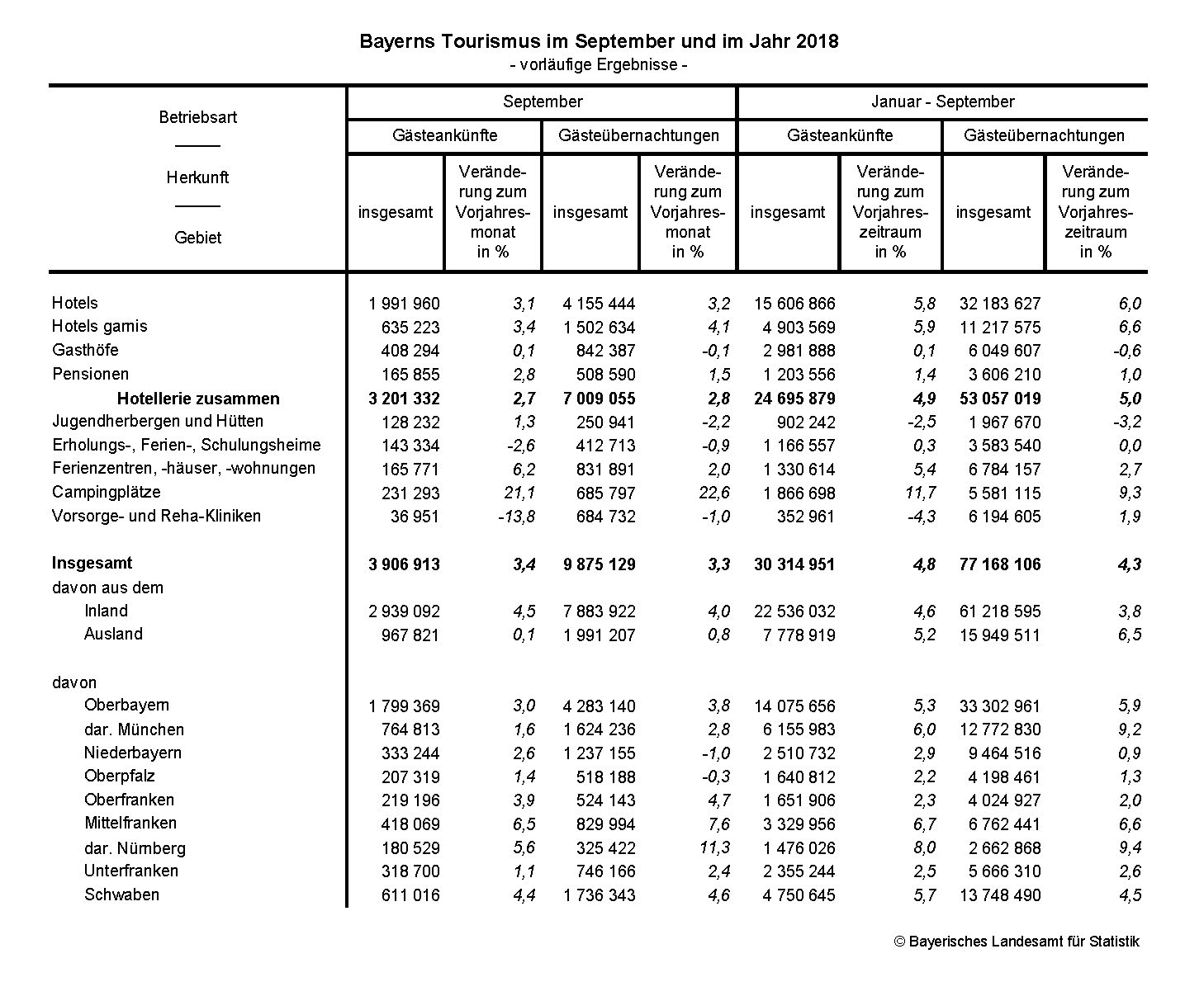 Im September 2018 stieg die Zahl der Gästeankünfte in Bayern gegenüber dem Vor-jahresmonat um 3,4 Prozent auf rund 3,9 Millionen, die Zahl der Übernachtungen wuchs um 3,3 Prozent auf gut 9,9 Millionen.