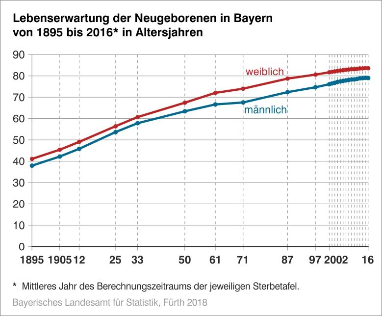 weiterhin konstant hoch. Sie beträgt für neugeborene Buben 79,1 und für neugeborene Mädchen 83,6 Jahre. Das heißt, dass bayerische Mädchen im Schnitt etwa 4,5 Jahre älter werden als ihre neugeborenen männlichen Mitbürger.