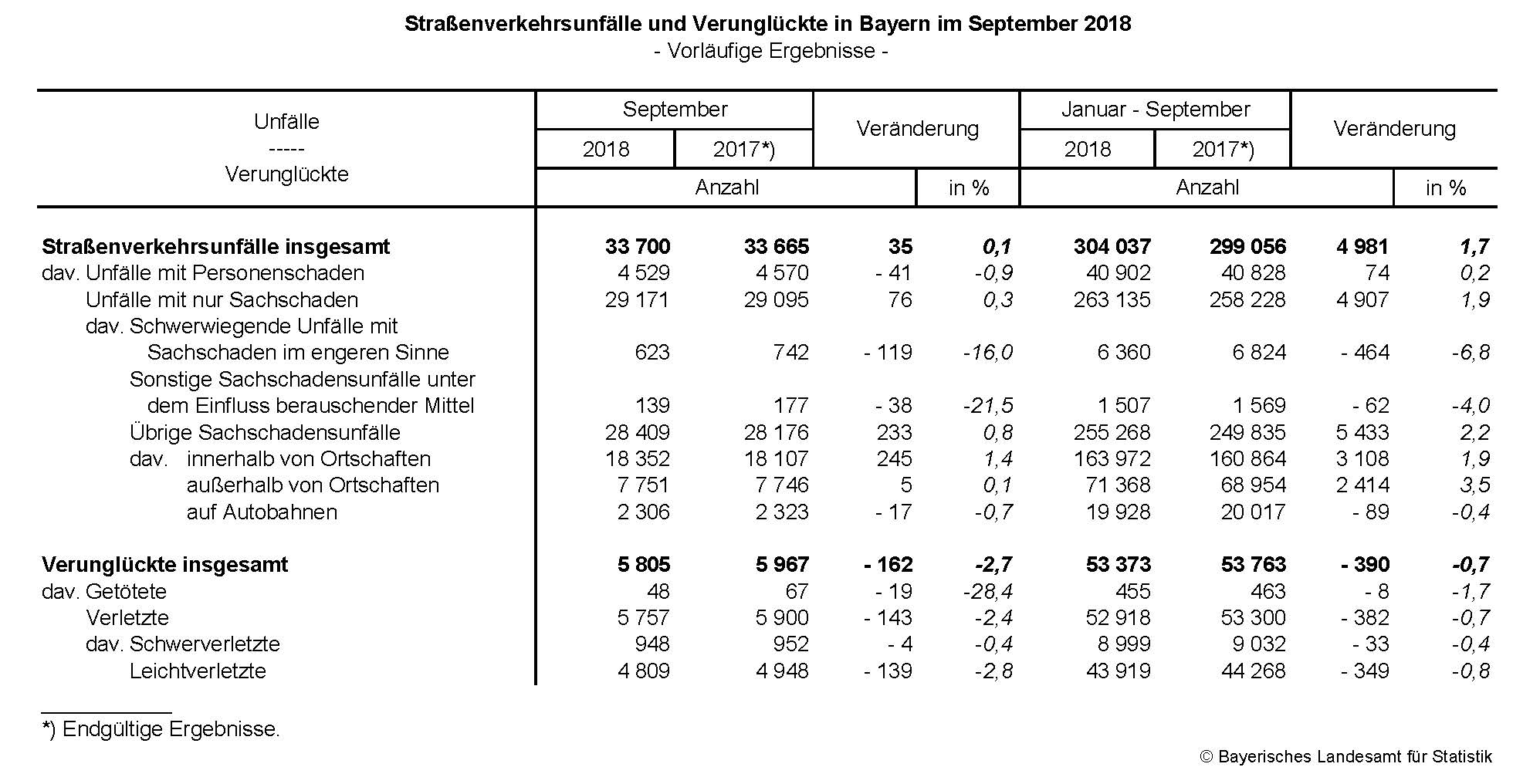 Wie das Bayerische Landesamt für Statistik mitteilt, entsprach die Zahl der Straßenverkehrsunfälle im September 2018 mit einem Plus von 0,1 Prozent in etwa dem Vorjahresmonat. Nach vorläufigen Ergebnissen registrierte die Polizei insgesamt 33 700 Unfälle (September 2017: 33 665). Bei diesen Unfällen kamen in 4 529 Fällen Personen zu Schaden – gegenüber September 2017 ein Rückgang um 0,9 Prozent.