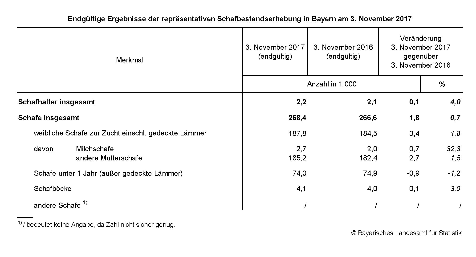 Nach den endgültigen Ergebnissen der vom Bayerischen Landesamt für Statistik durchgeführten Schafbestandserhebung zum 3. November 2017 stieg die Anzahl der Schafhaltungsbetriebe auf 2 200 an. Dies entspricht einem Zuwachs von rund 4,0 Prozent. Der Schafbestand steigt dabei um 0,7 Prozent auf 268 400 Tiere im Vergleich zum Vorjahreswert.