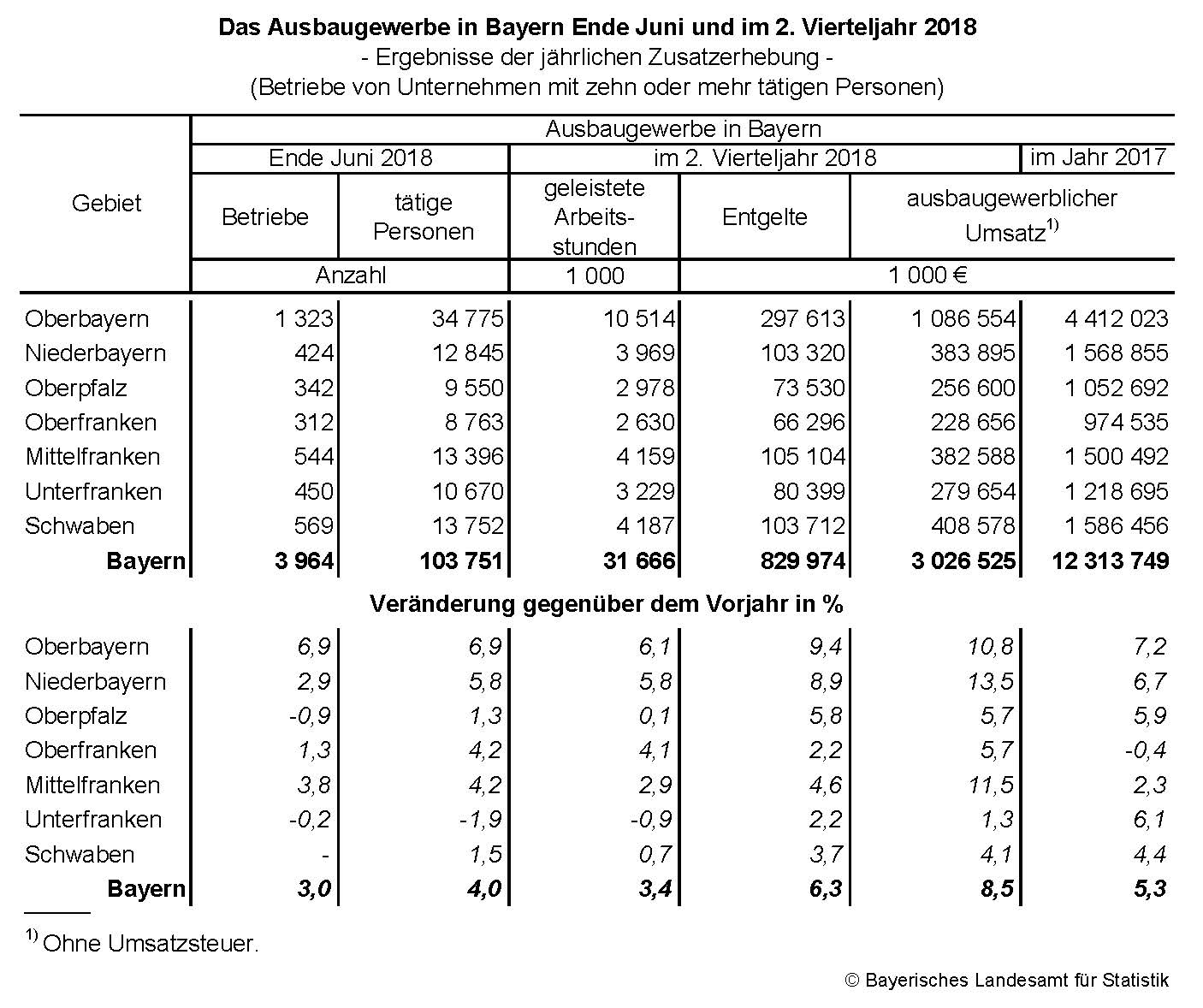Der von den festgestellten 3 964 Betrieben im Ausbaugewerbe in Bayern im zweiten Vierteljahr 2018 erwirtschaftete ausbaugewerbliche Umsatz belief sich auf insgesamt 3,03 Milliarden Euro (+8,5 Prozent gegenüber dem zweiten Vierteljahr 2017), darunter fast 1,09 Milliarden Euro (+10,8 Prozent) von insgesamt 1 323 im Regierungsbezirk Oberbayern ansässigen ausbaugewerblichen Betrieben. Ein Umsatzplus im Vergleich zum Vorjahresergebnis verzeichneten im Durchschnitt auch die in den anderen sechs bayerischen Regierungsbezirken angesiedelten ausbaugewerblichen Betriebe, und zwar zwischen 1,3 Prozent (Unterfranken) und 13,5 Prozent (Niederbayern).